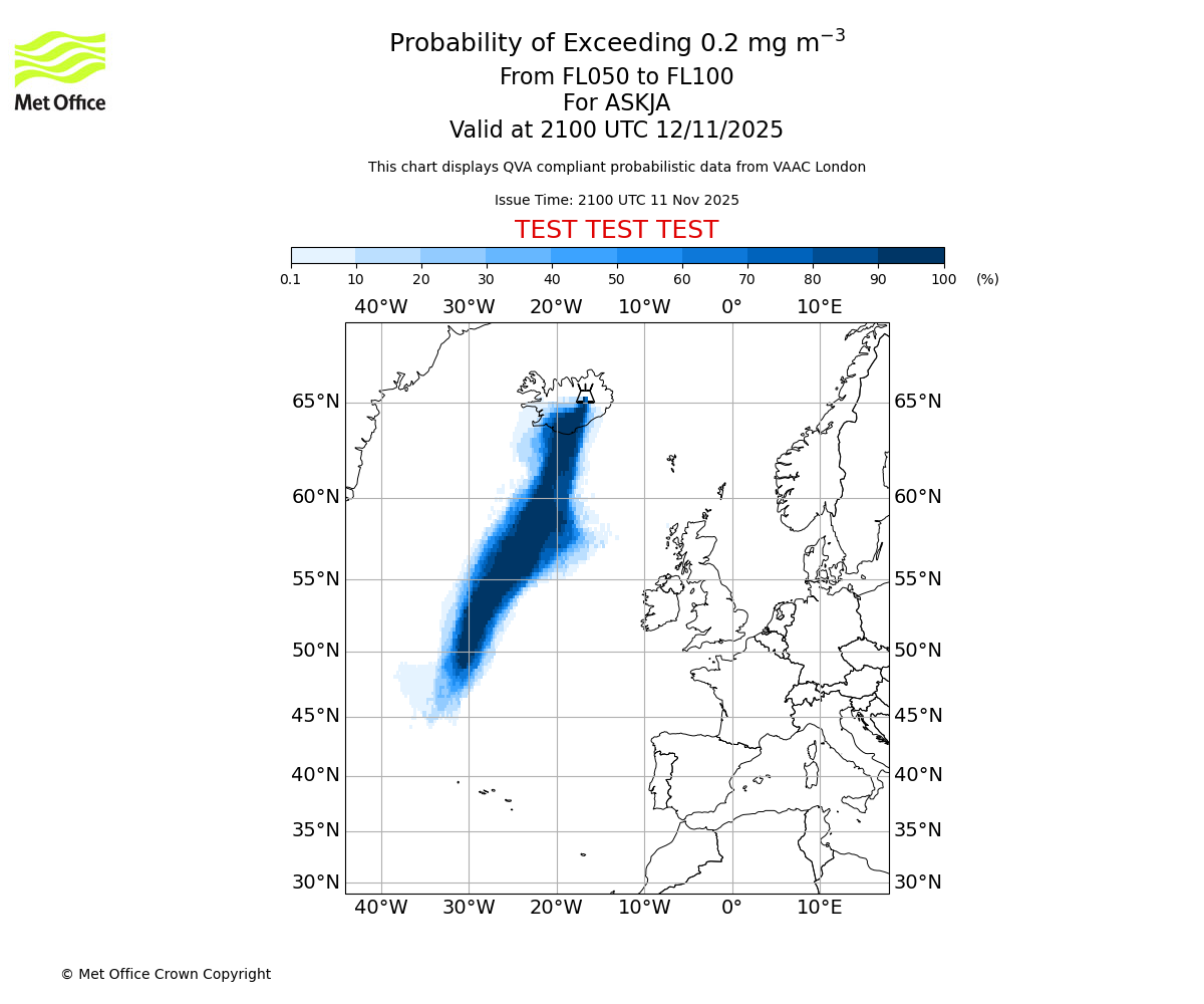 Probability of exceeding 0.2 milligrams per metre cubed. From 000 to 050 for ASKJA. Valid at 2100 UTC 12/11/2025