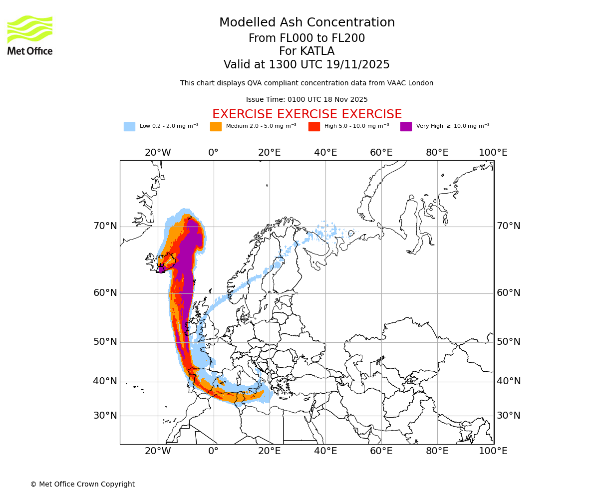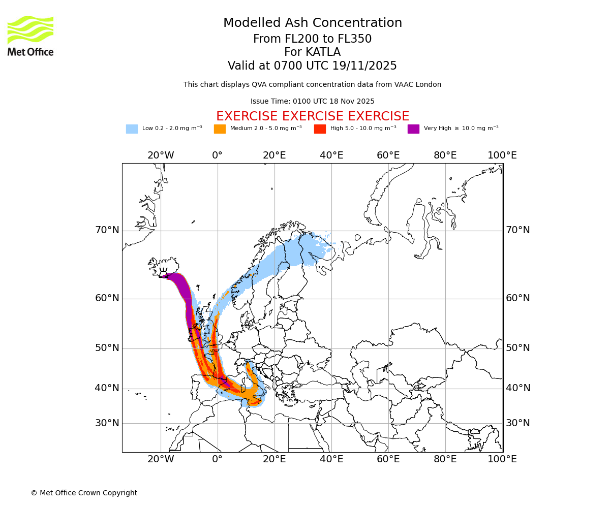 Modelled ash concentration from 000 to 200 for KATLA. Valid at 0700 UTC 19/11/2025