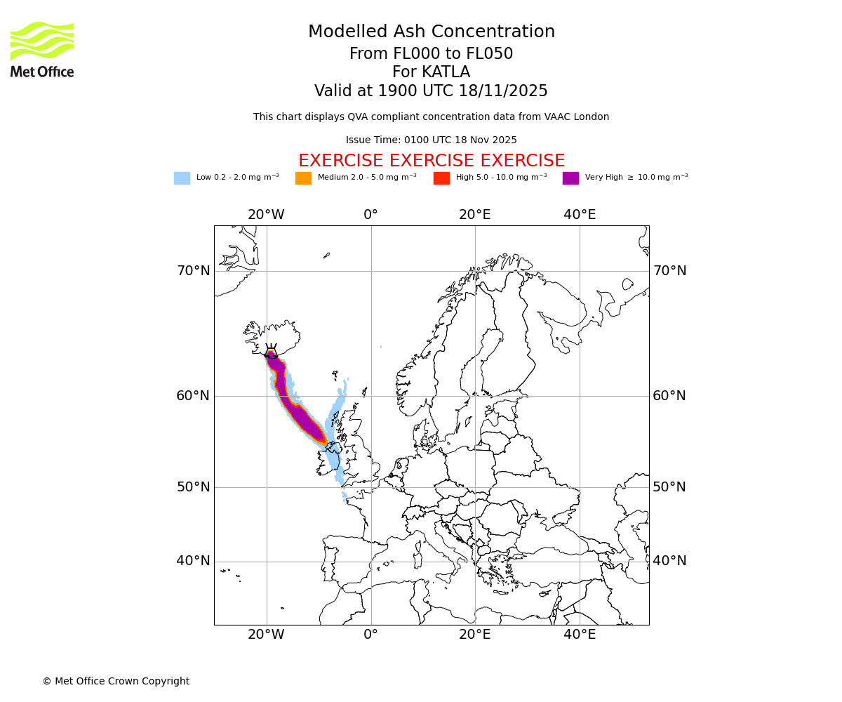 Modelled ash concentration from 000 to 200 for KATLA. Valid at 0100 UTC 18/11/2025