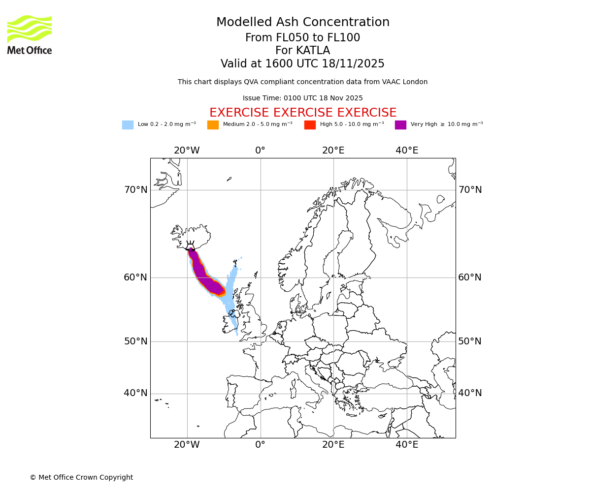 Modelled ash concentration from 000 to 050 for KATLA. Valid at 1600 UTC 18/11/2025