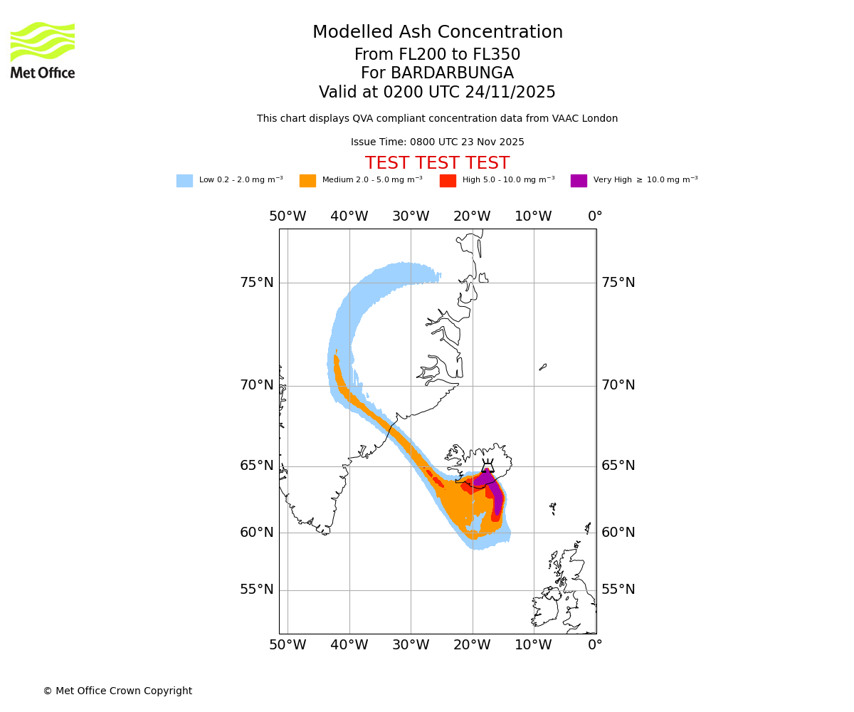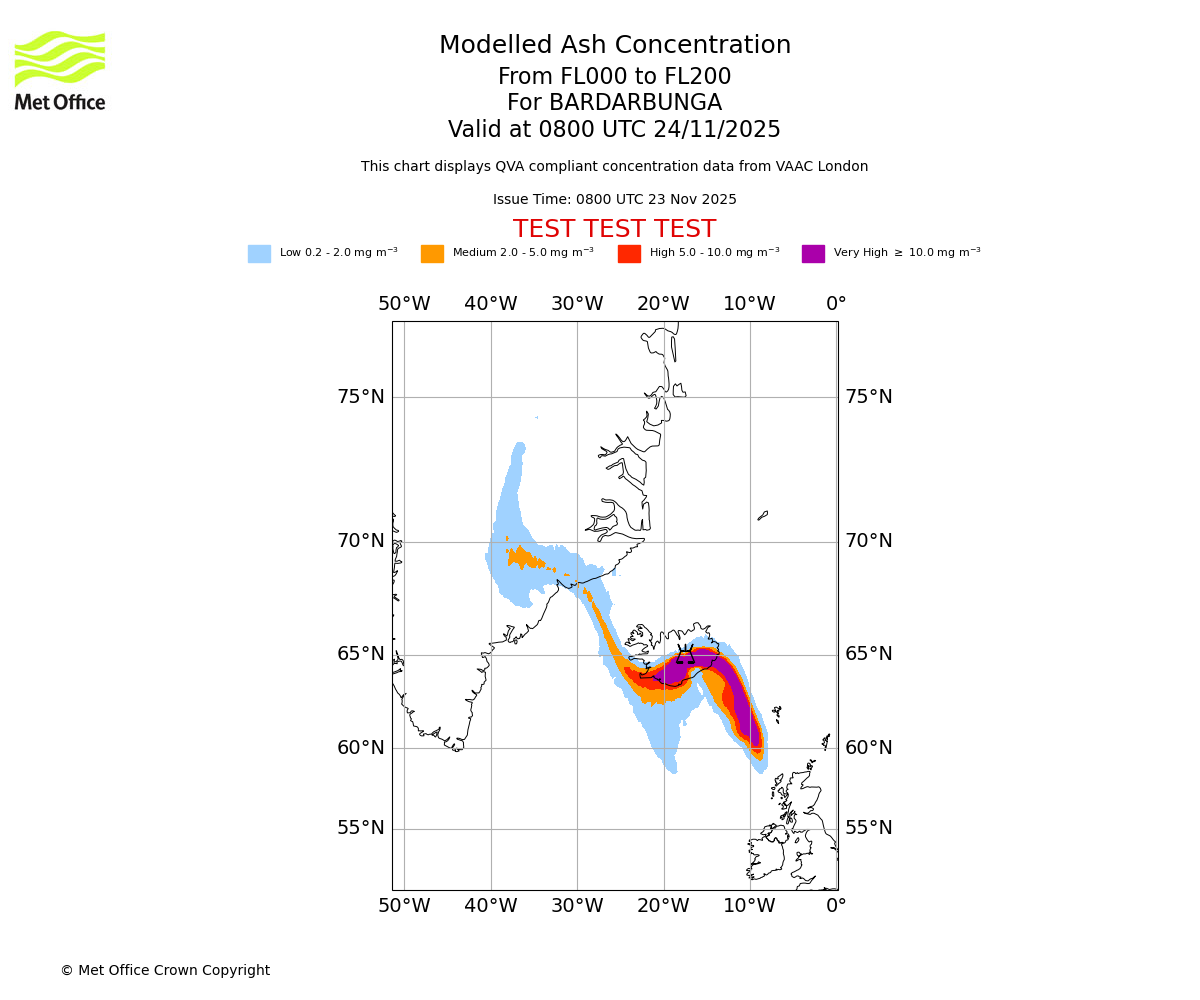 Modelled ash concentration from 000 to 200 for BARDARBUNGA. Valid at 0200 UTC 24/11/2025