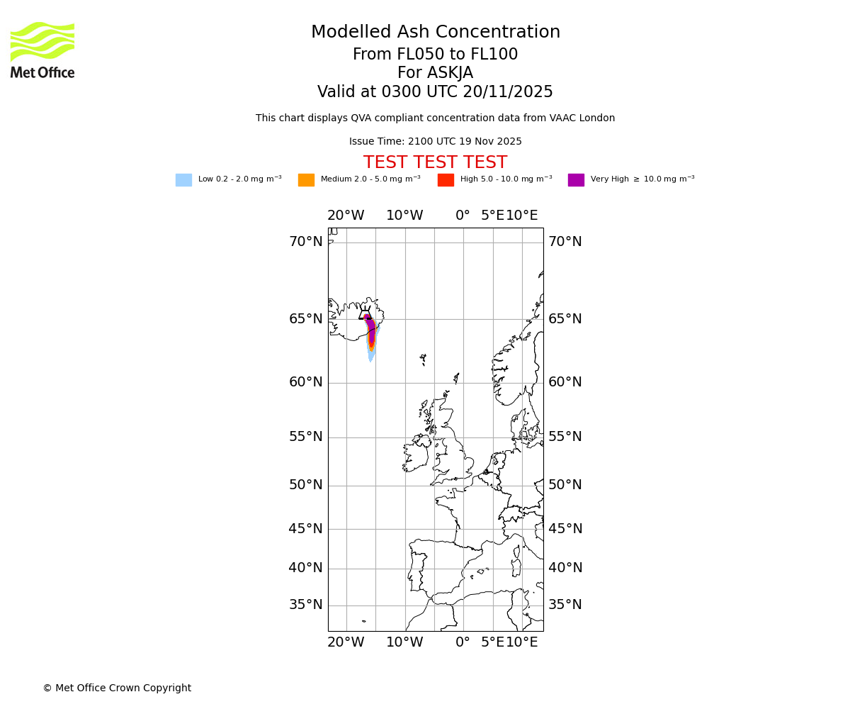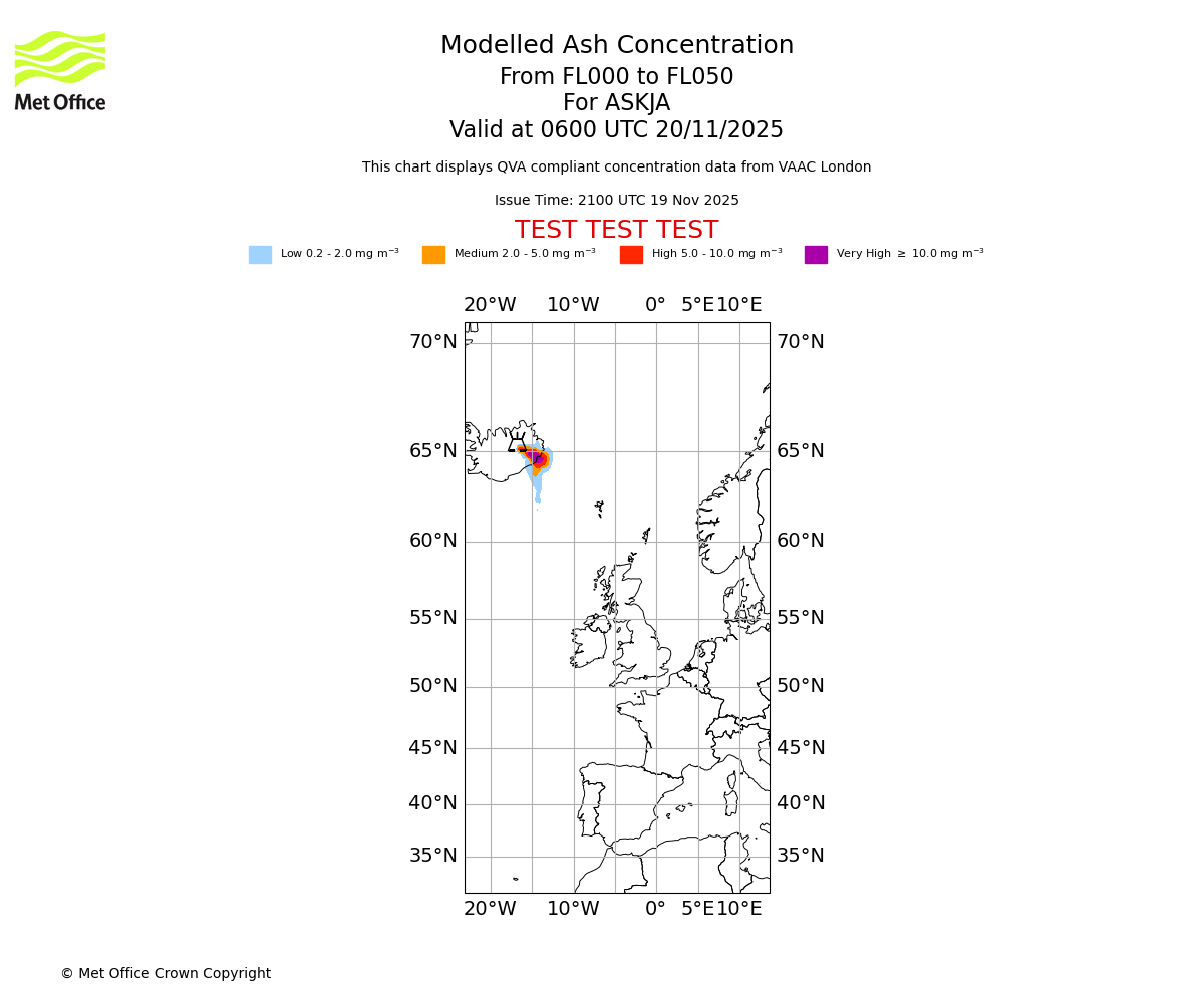 In accordance with ICAO Annex 3, Amendment 82 VAAC London will provide operational QVA forecasts from 27 November 2025 and these will be made available via a VAAC London QVA API information service. These charts are currently provided for test and evaluation purposes (not for operational use) until the introduction of the operational service.