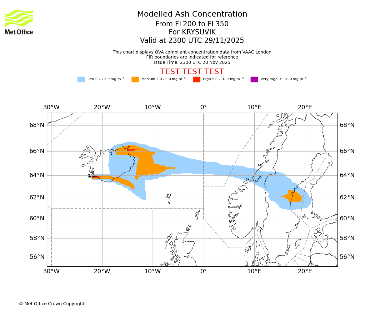 Modelled ash concentration from 000 to 200 for KRYSUVIK. Valid at 2300 UTC 29/11/2025