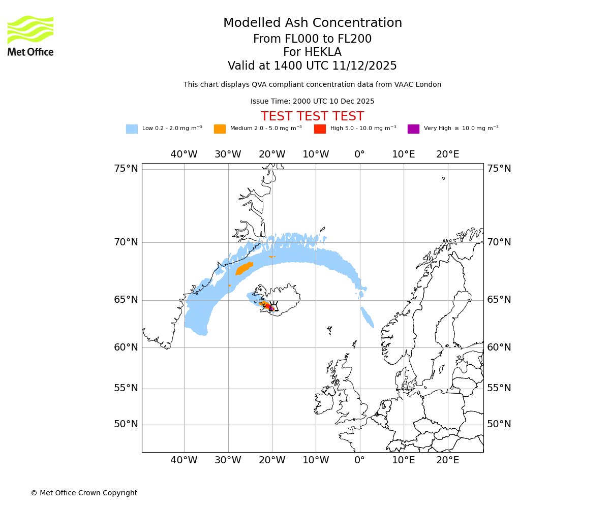 Modelled ash concentration from 000 to 050 for HEKLA. Valid at 2000 UTC 10/12/2025