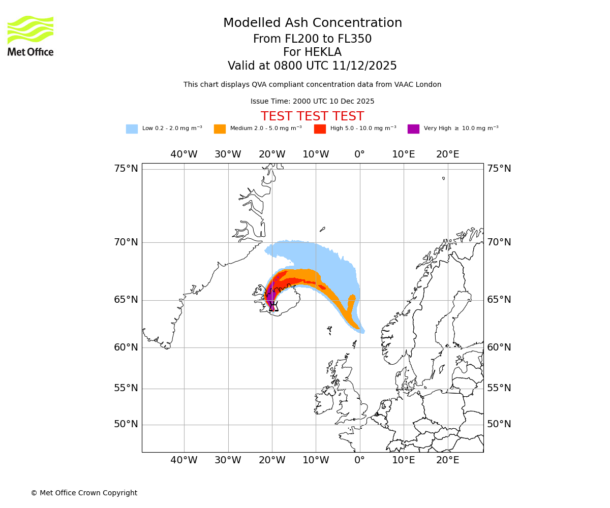 Modelled ash concentration from 000 to 200 for HEKLA. Valid at 0800 UTC 11/12/2025