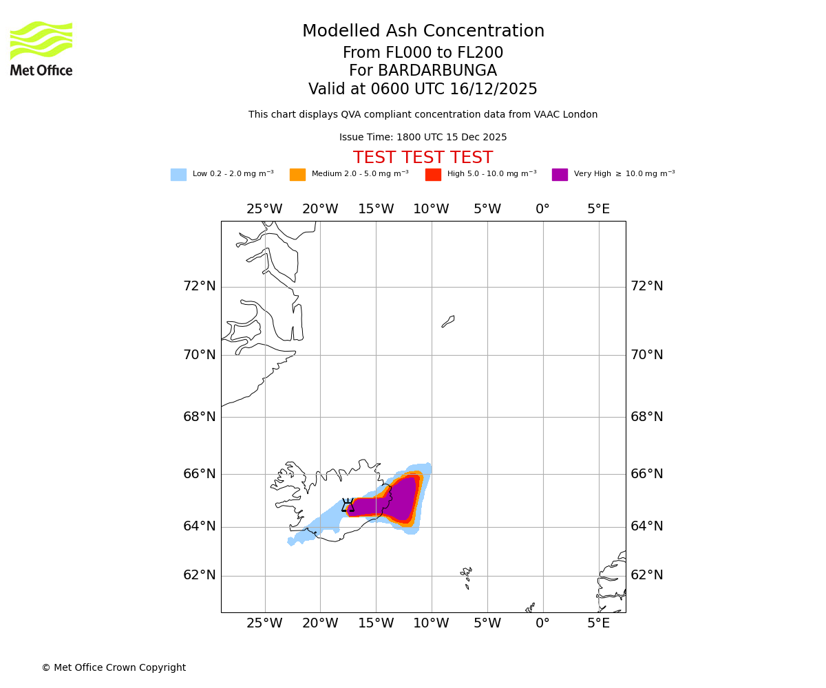 Modelled ash concentration from 000 to 200 for BARDARBUNGA. Valid at 0000 UTC 16/12/2025