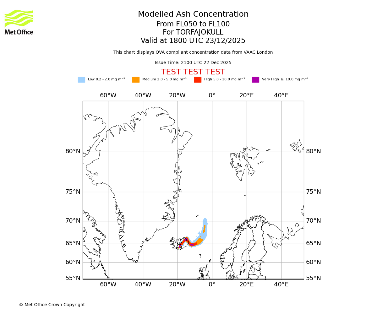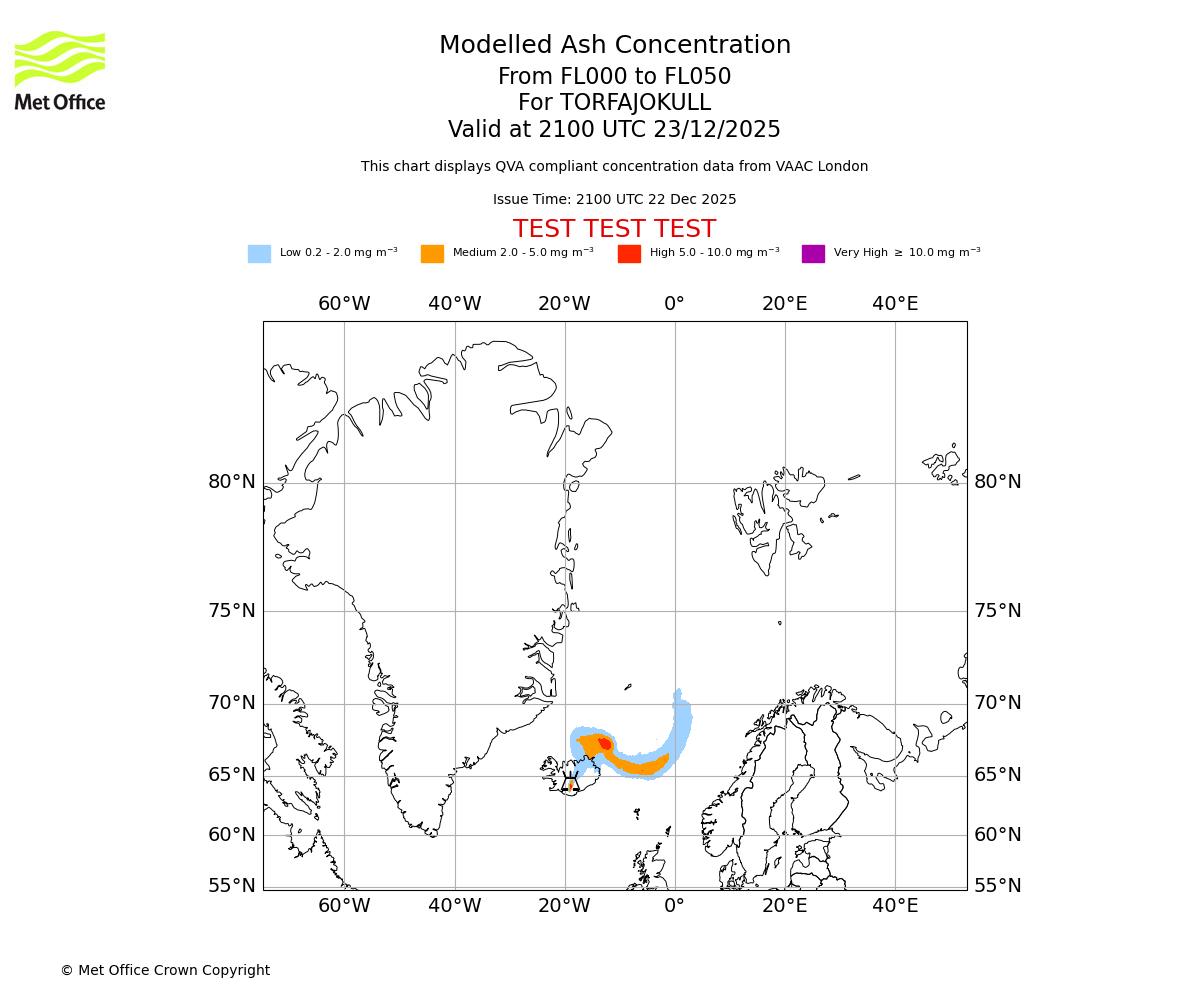 Modelled ash concentration from 000 to 050 for TORFAJOKULL. Valid at 1800 UTC 23/12/2025