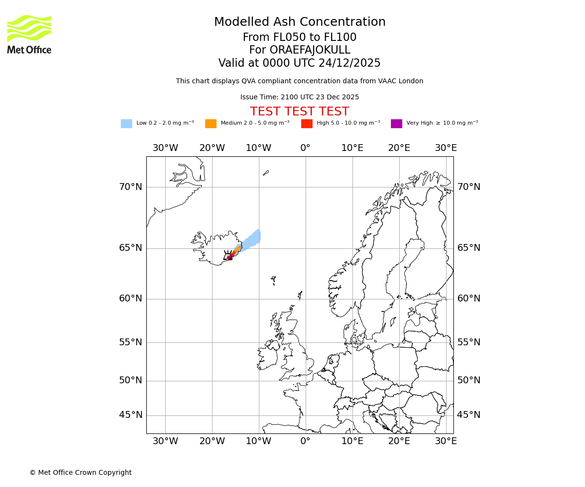 Modelled ash concentration from 000 to 050 for ORAEFAJOKULL. Valid at 0000 UTC 24/12/2025