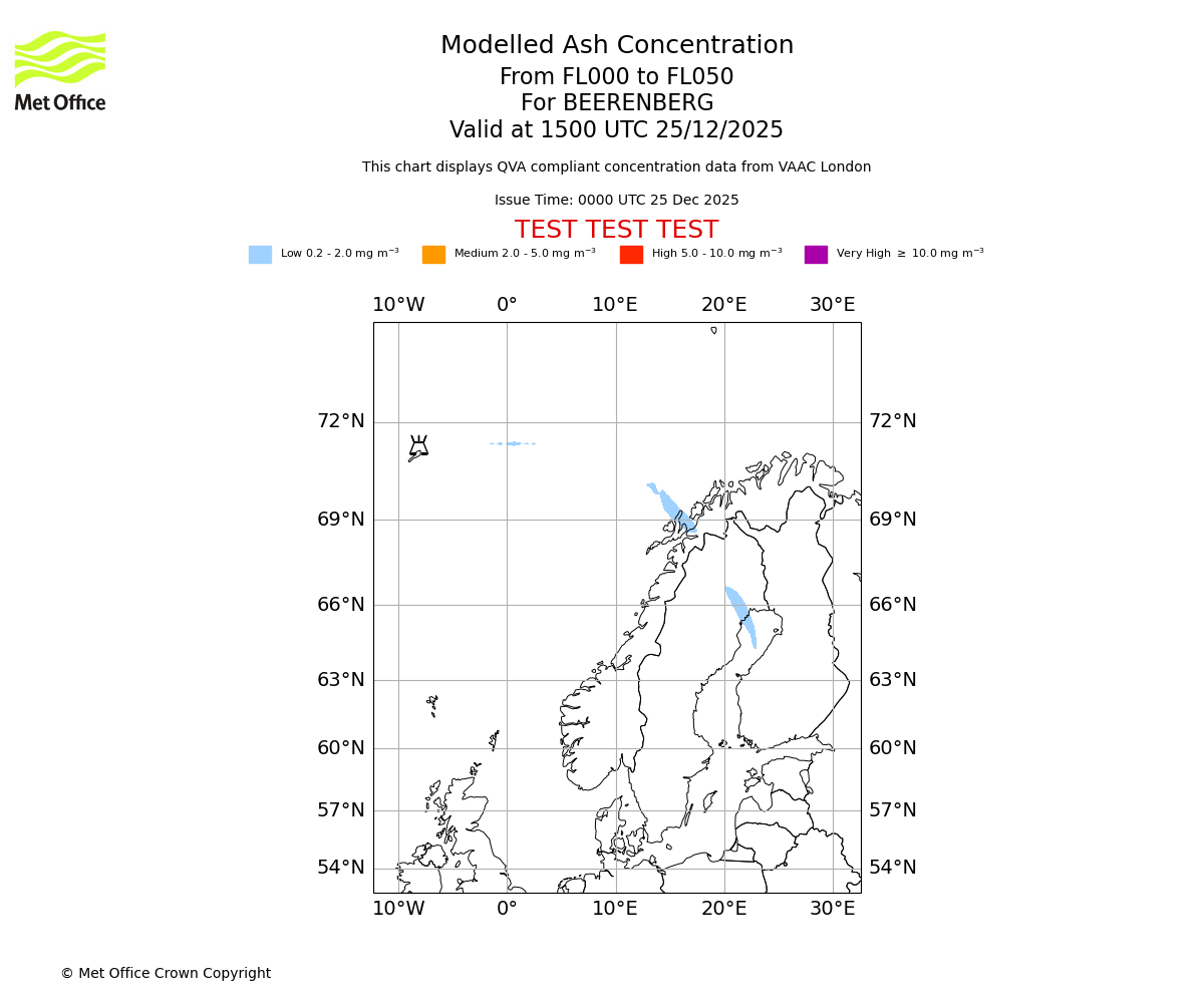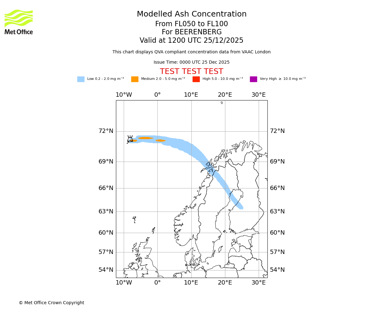 Modelled ash concentration from 000 to 050 for BEERENBERG. Valid at 1200 UTC 25/12/2025