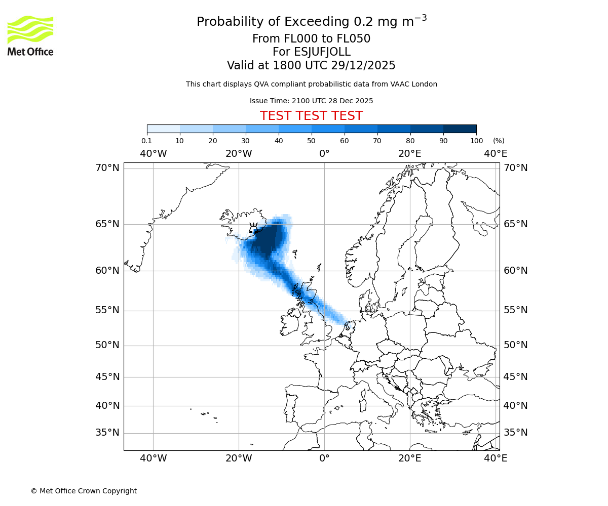 Modelled ash concentration from 000 to 200 for ESJUFJOLL. Valid at 2100 UTC 28/12/2025