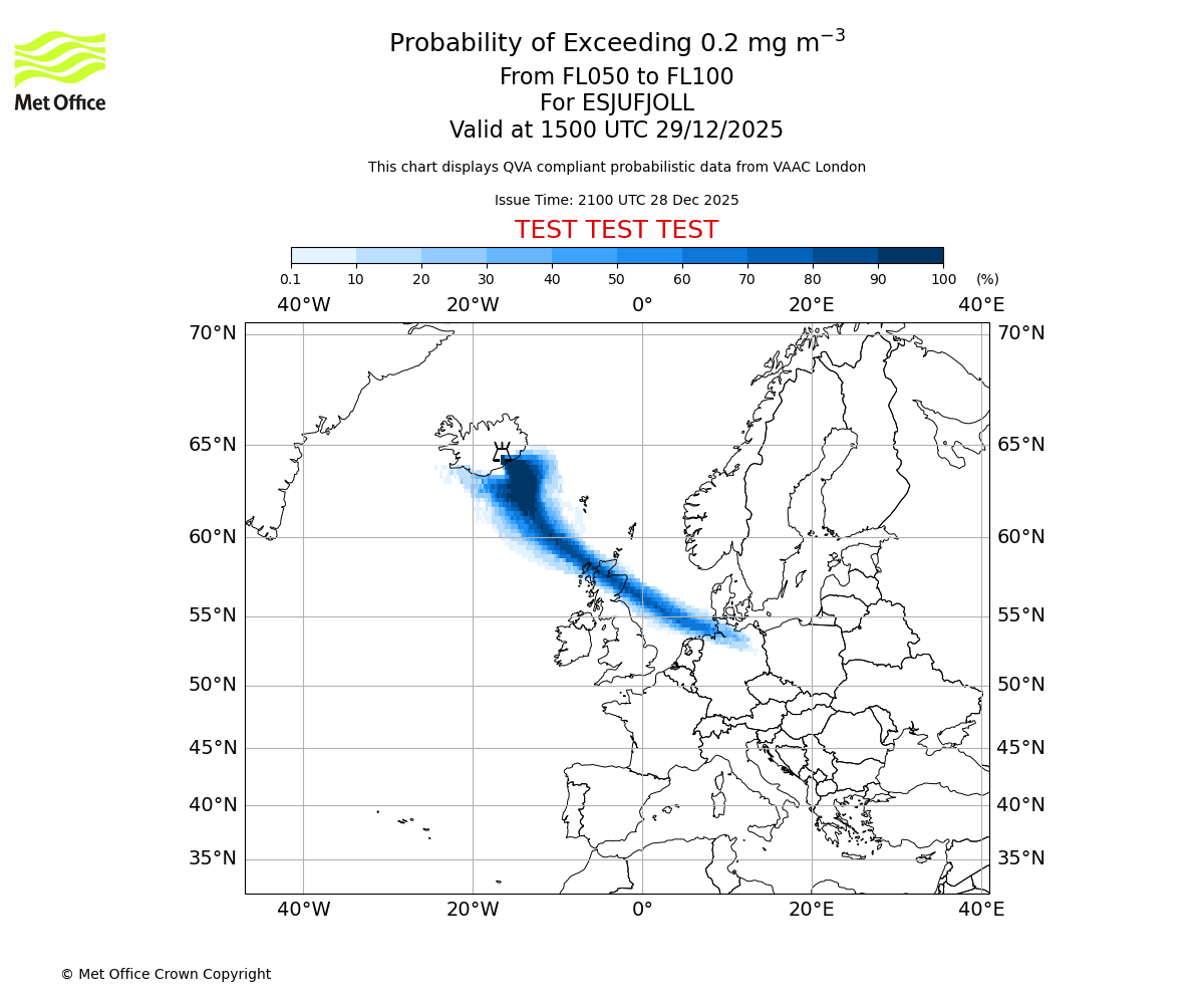 Quantitative Volcanic Ash charts (QVA) are produced in accordance with International Civil Aviation Organization (ICAO) Annex 3 requirements and are provided as well as the London Volcanic Ash Advisory Graphics (VAG) and Advisories (VAA). The lowest QVA threshold (0.2 mg/m³) matches to the areas depicted in the VAA and VAG. Both expected ash concentration and probabilistic forecast information is provided in the chart viewer below for eruptions occurring in the London Volcanic Ash Advisory Centre (VAAC) area of responsibility.