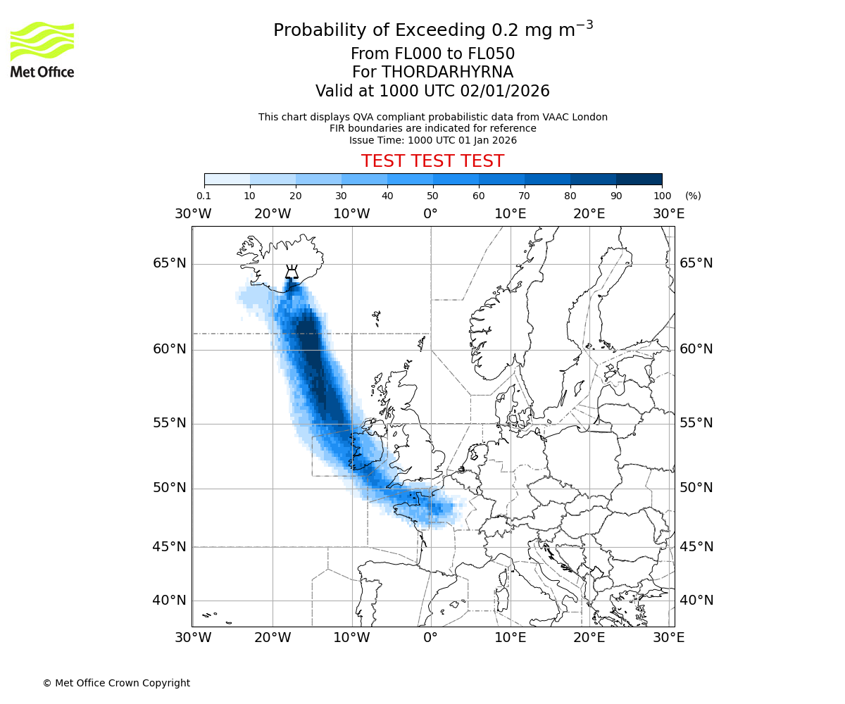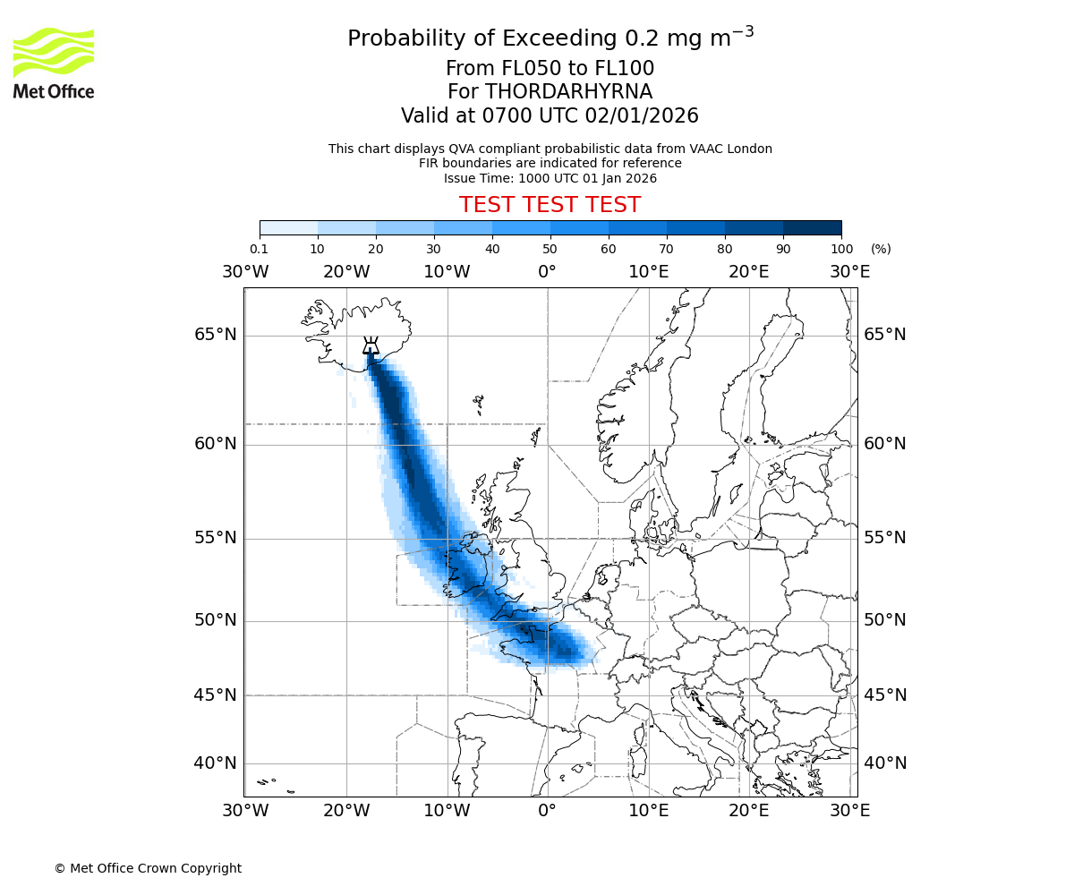 Probability of exceeding 0.2 milligrams per metre cubed. From 000 to 050 for THORDARHYRNA. Valid at 0700 UTC 02/01/2026