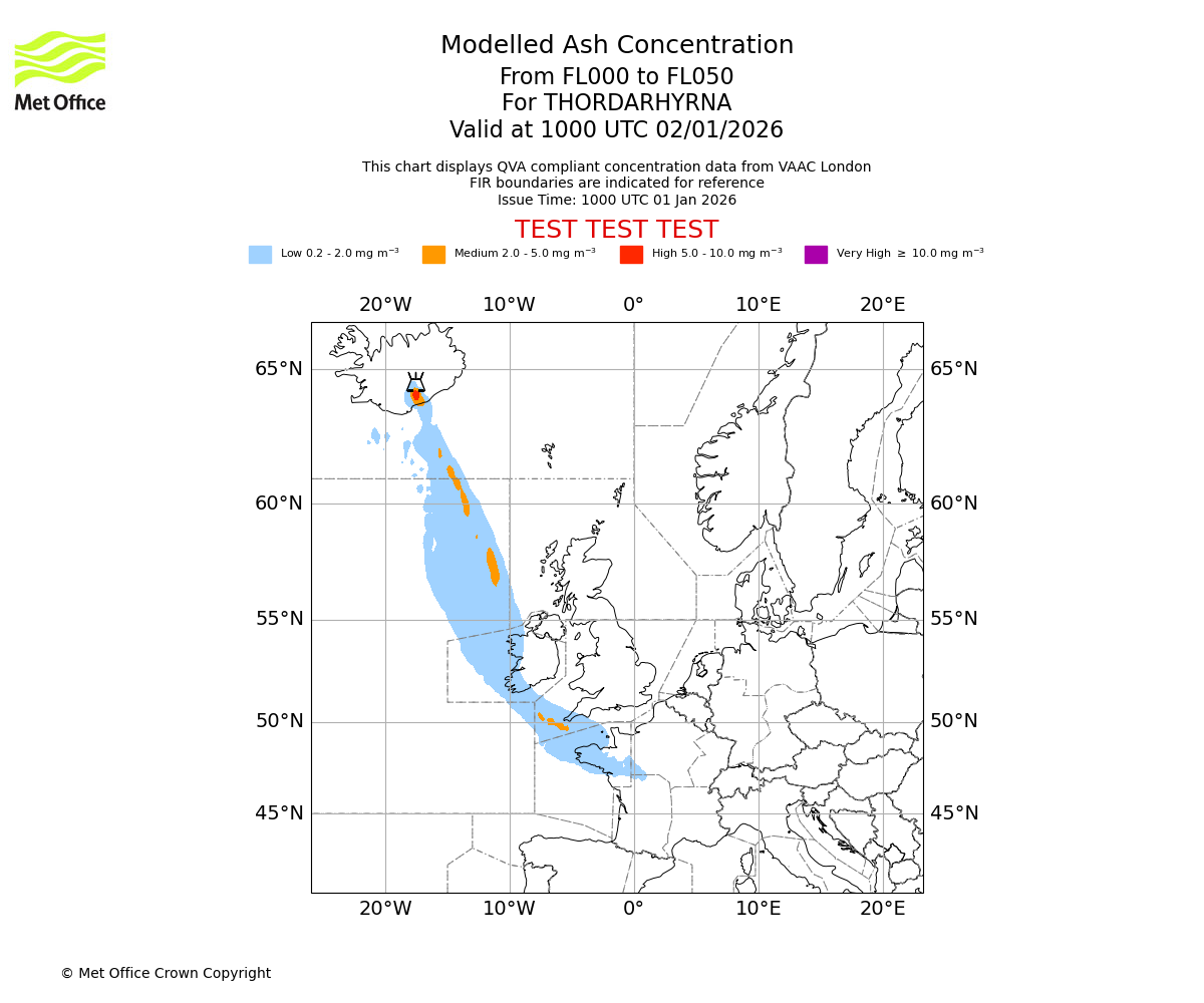 Modelled ash concentration from 000 to 200 for THORDARHYRNA. Valid at 1000 UTC 01/01/2026