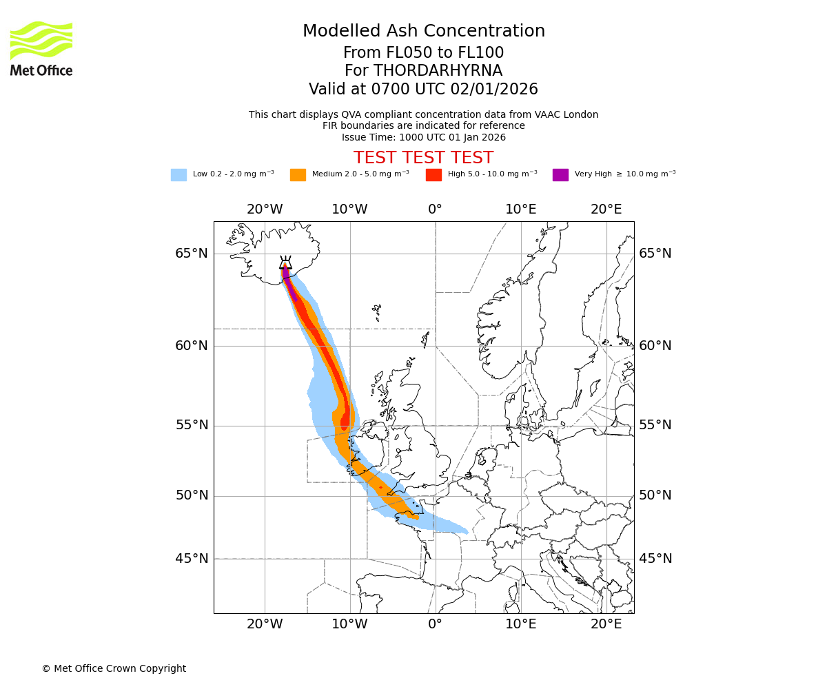 Modelled ash concentration from 000 to 050 for THORDARHYRNA. Valid at 0700 UTC 02/01/2026