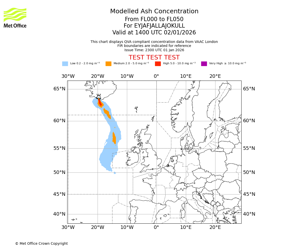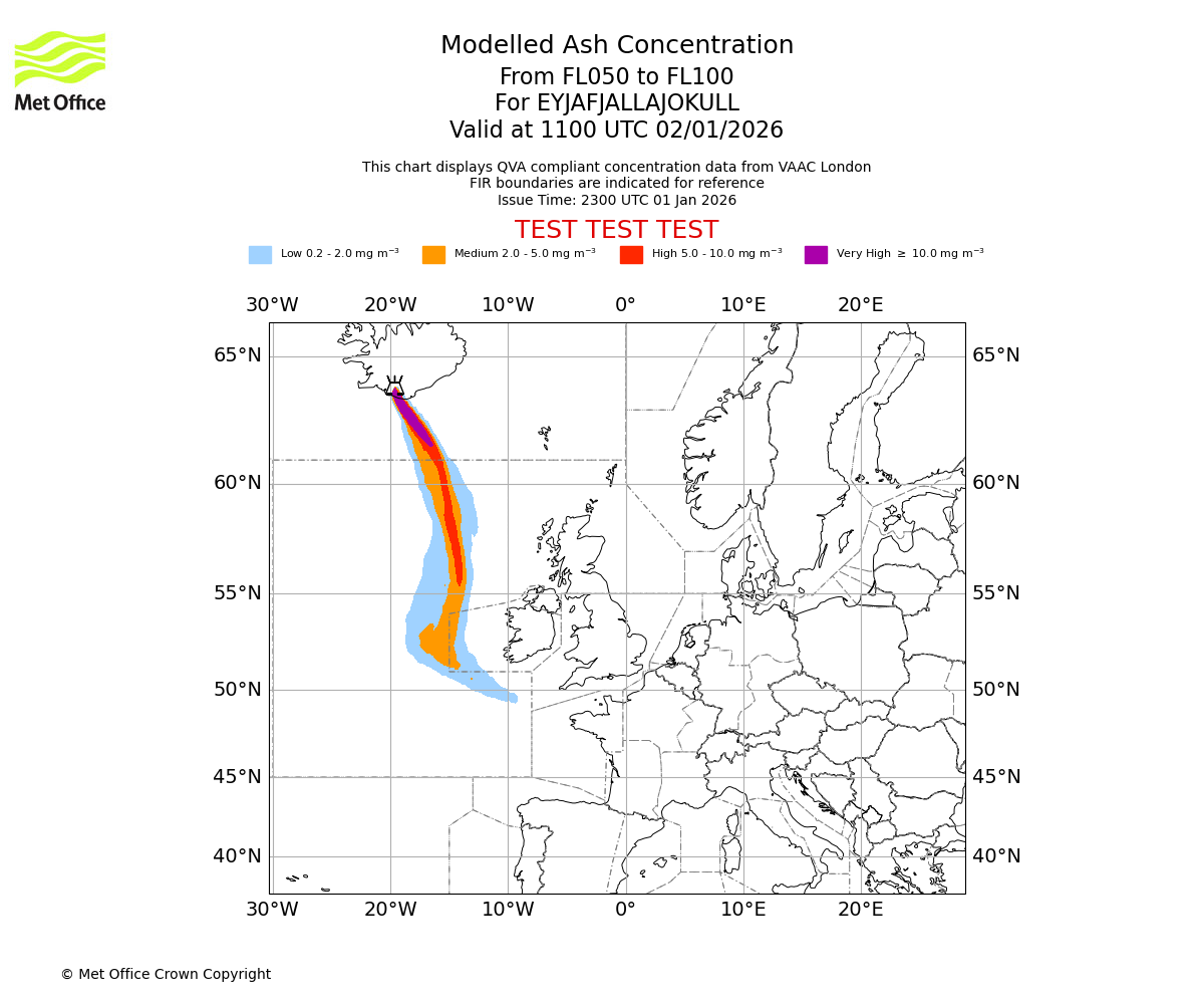 Modelled ash concentration from 000 to 050 for EYJAFJALLAJOKULL. Valid at 1100 UTC 02/01/2026