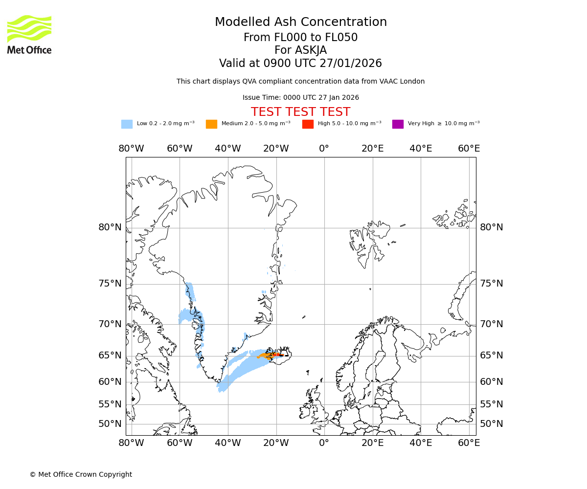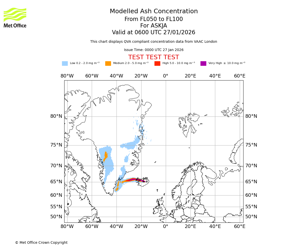 Modelled ash concentration from 000 to 050 for ASKJA. Valid at 0600 UTC 27/01/2026
