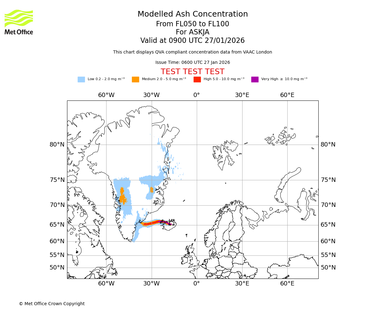 Modelled ash concentration from 000 to 050 for ASKJA. Valid at 0900 UTC 27/01/2026