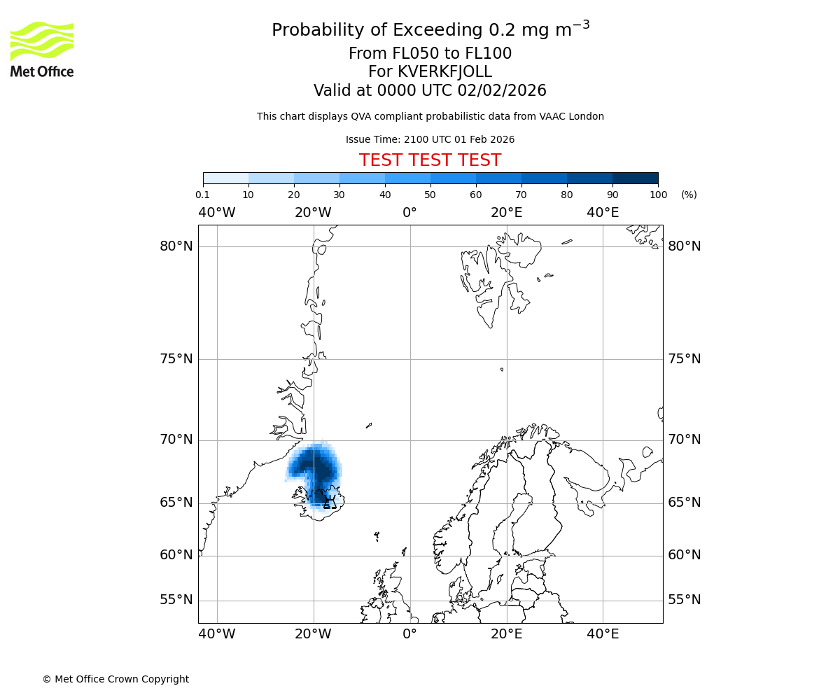 Probability of exceeding 0.2 milligrams per metre cubed. From 000 to 050 for KVERKFJOLL. Valid at 0000 UTC 02/02/2026