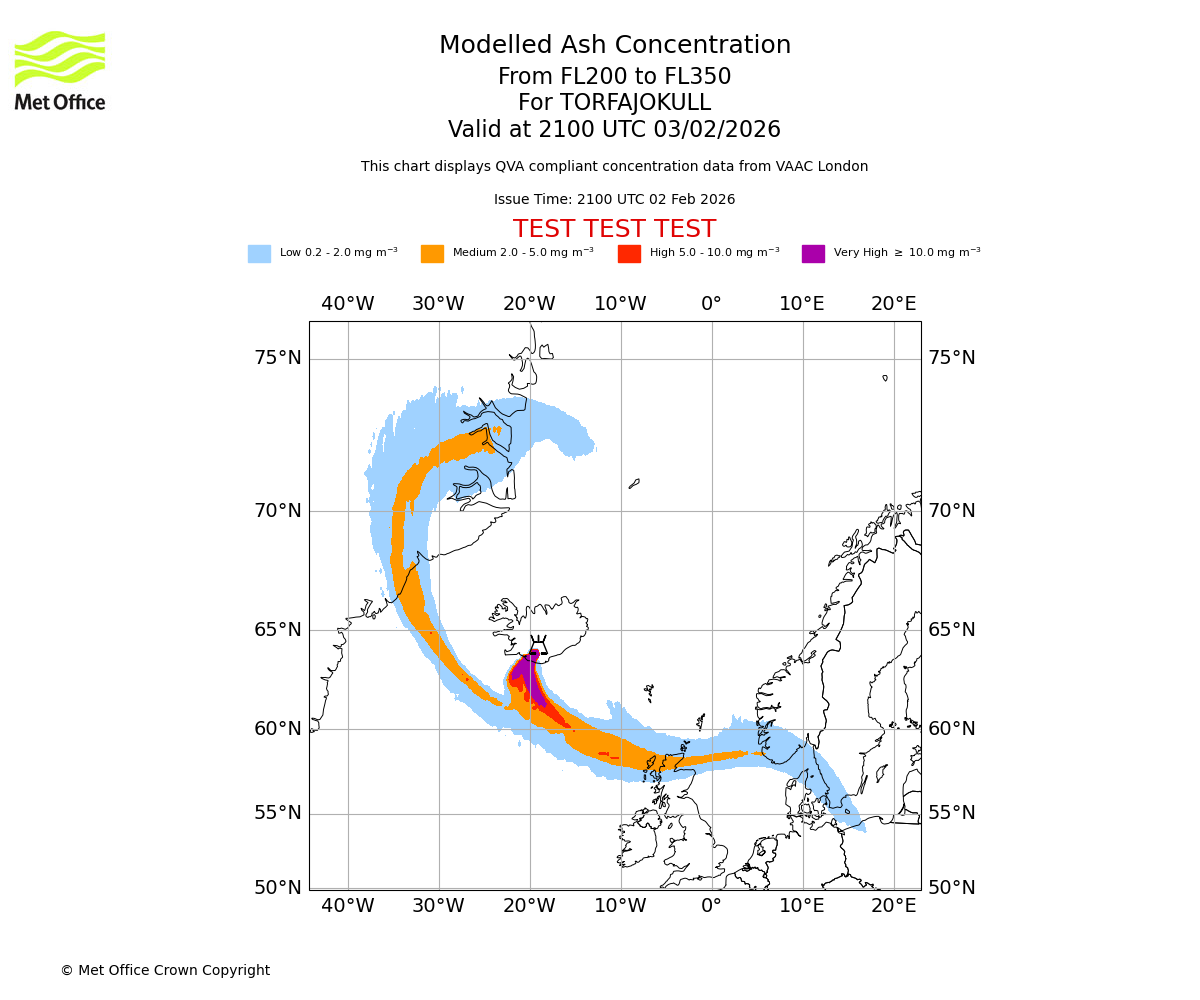 Modelled ash concentration from 000 to 200 for TORFAJOKULL. Valid at 2100 UTC 03/02/2026