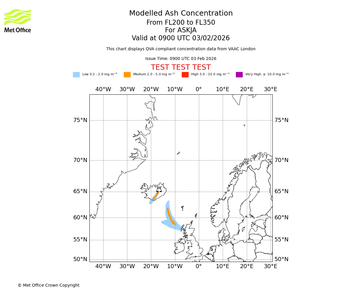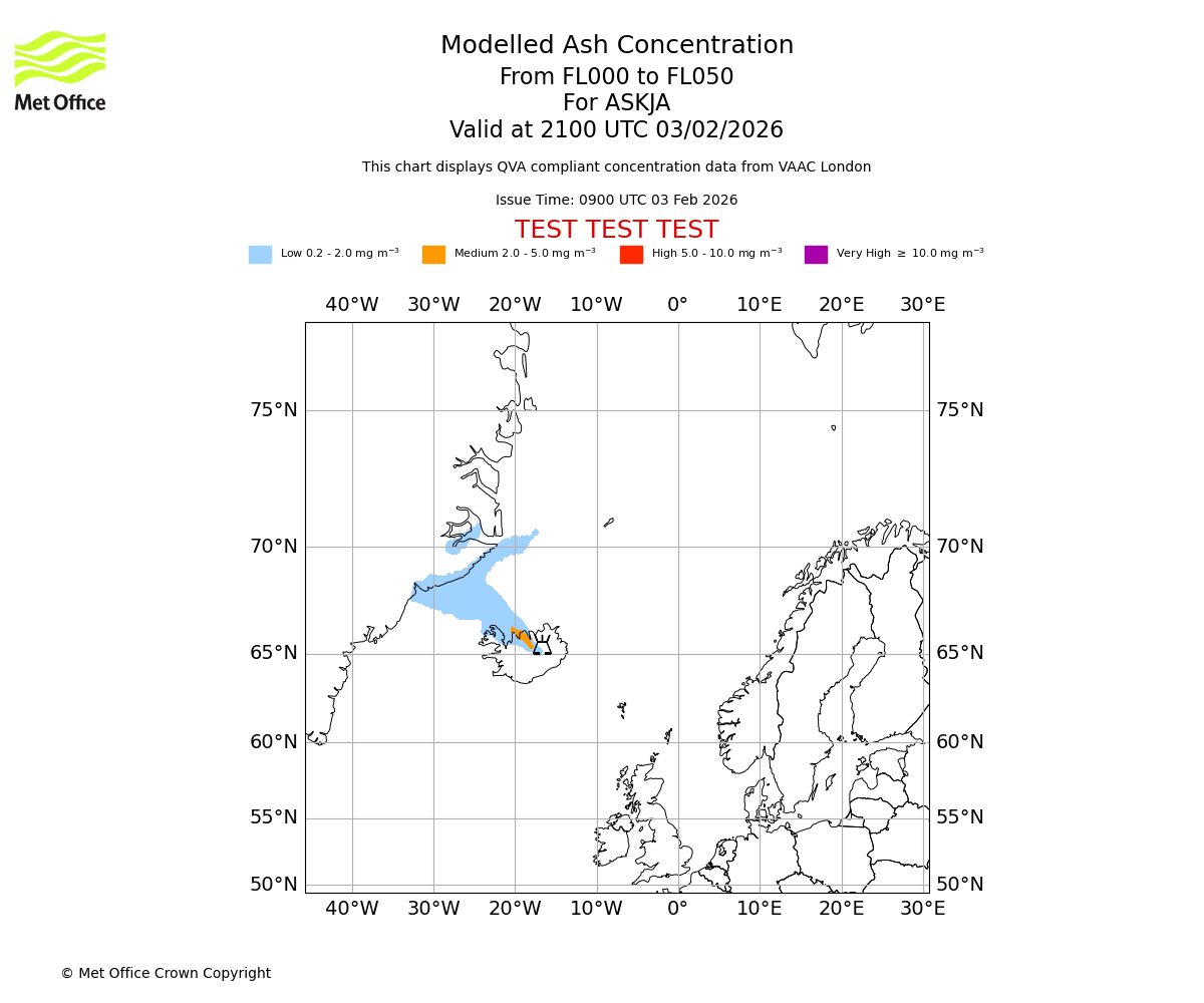 Modelled ash concentration from 000 to 200 for ASKJA. Valid at 0900 UTC 03/02/2026