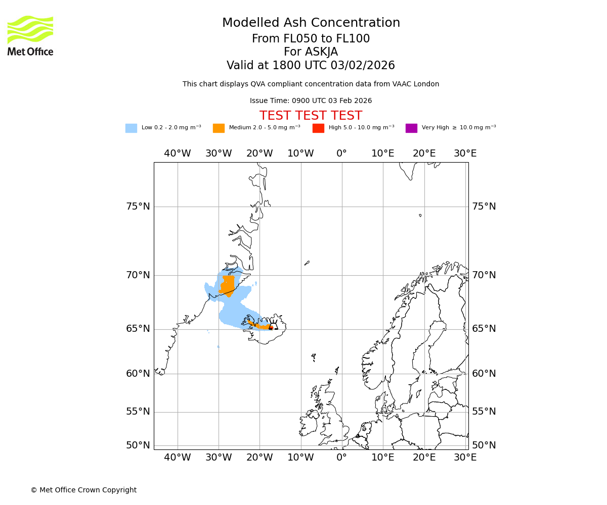 Modelled ash concentration from 000 to 050 for ASKJA. Valid at 1800 UTC 03/02/2026