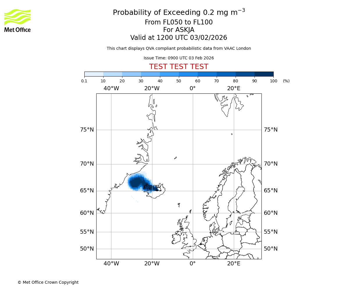 Probability of exceeding 0.2 milligrams per metre cubed. From 000 to 050 for ASKJA. Valid at 1200 UTC 03/02/2026