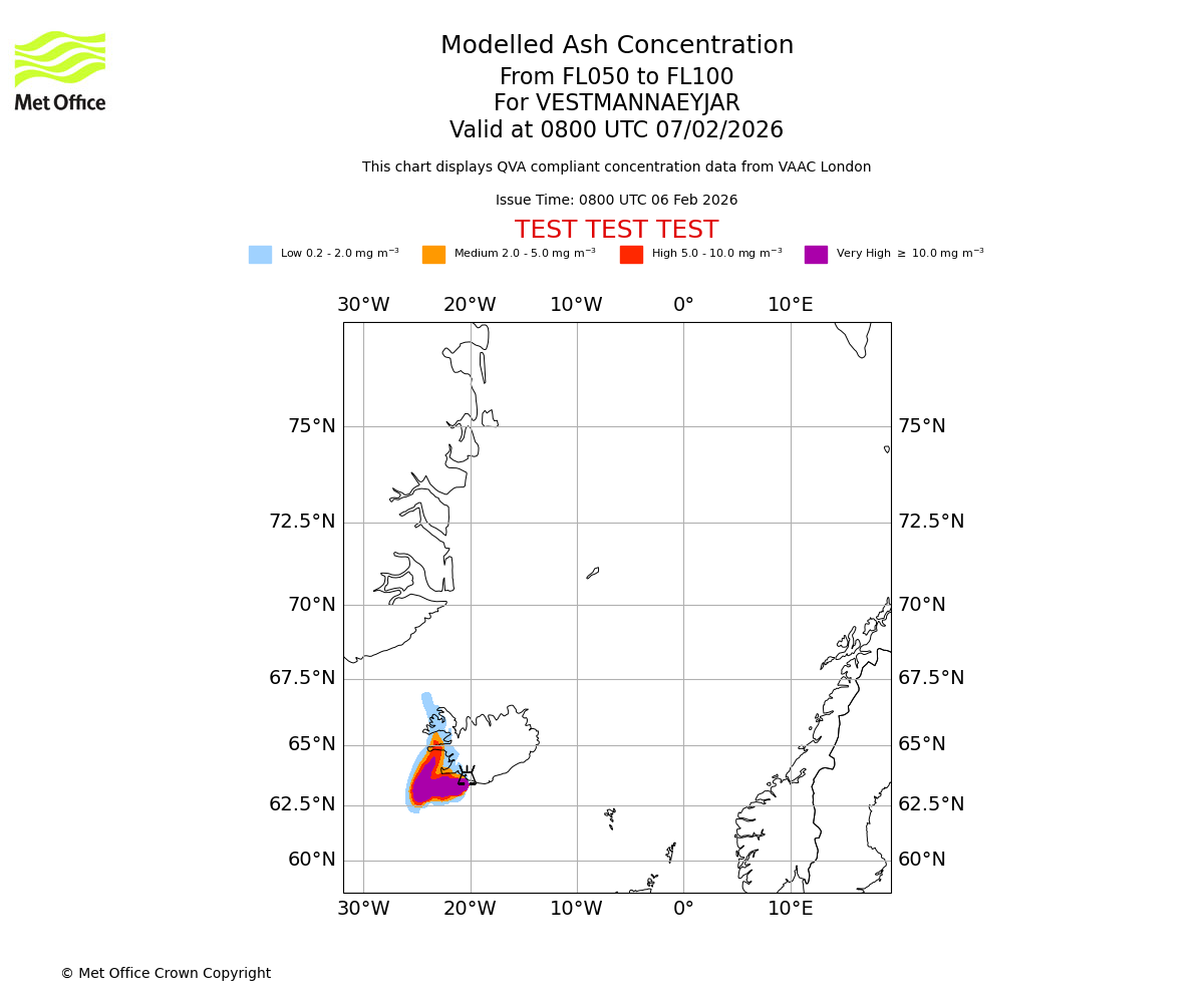 Modelled ash concentration from 000 to 050 for VESTMANNAEYJAR. Valid at 0800 UTC 07/02/2026