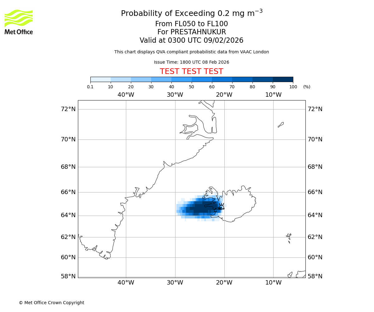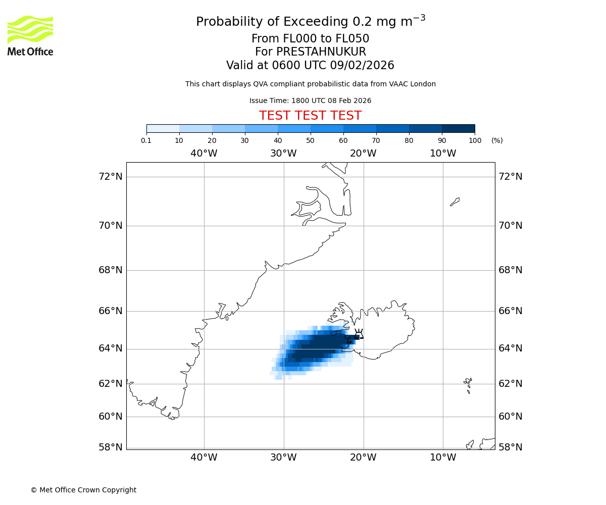 Modelled ash concentration from 000 to 050 for PRESTAHNUKUR. Valid at 1800 UTC 08/02/2026