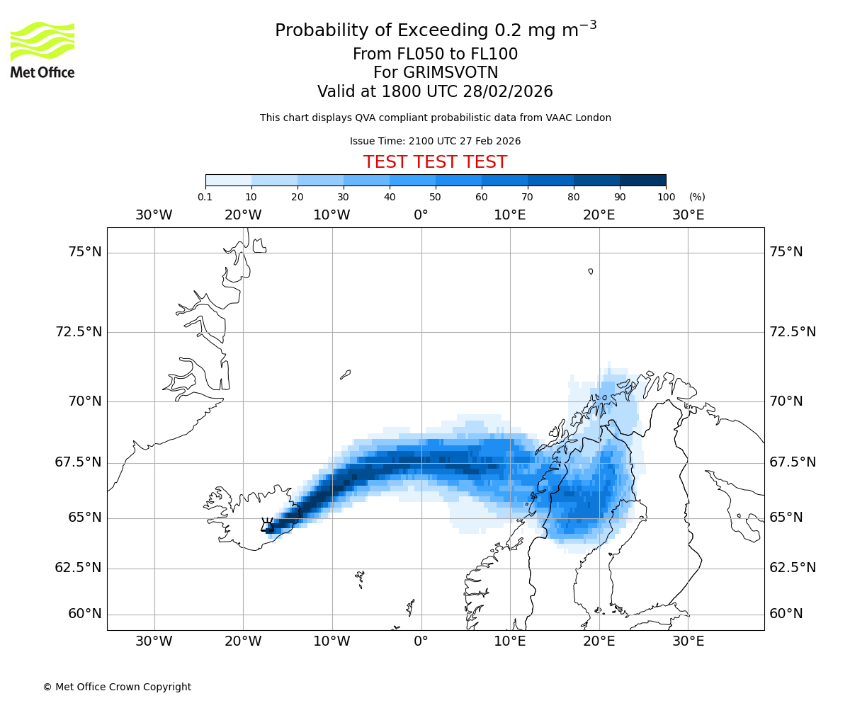 Probability of exceeding 0.2 milligrams per metre cubed. From 000 to 050 for GRIMSVOTN. Valid at 1800 UTC 28/02/2026