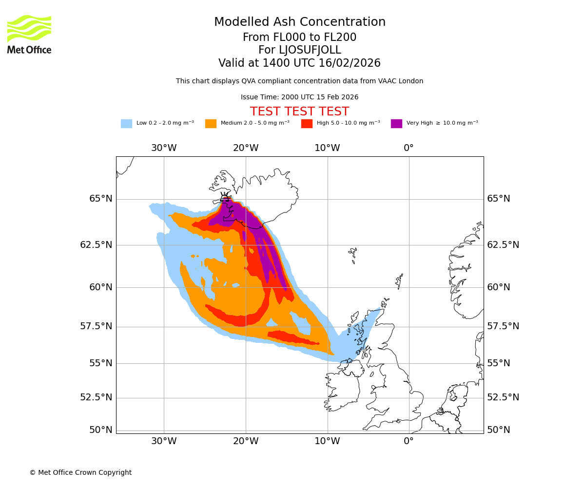 Modelled ash concentration from 000 to 200 for LJOSUFJOLL. Valid at 0800 UTC 16/02/2026