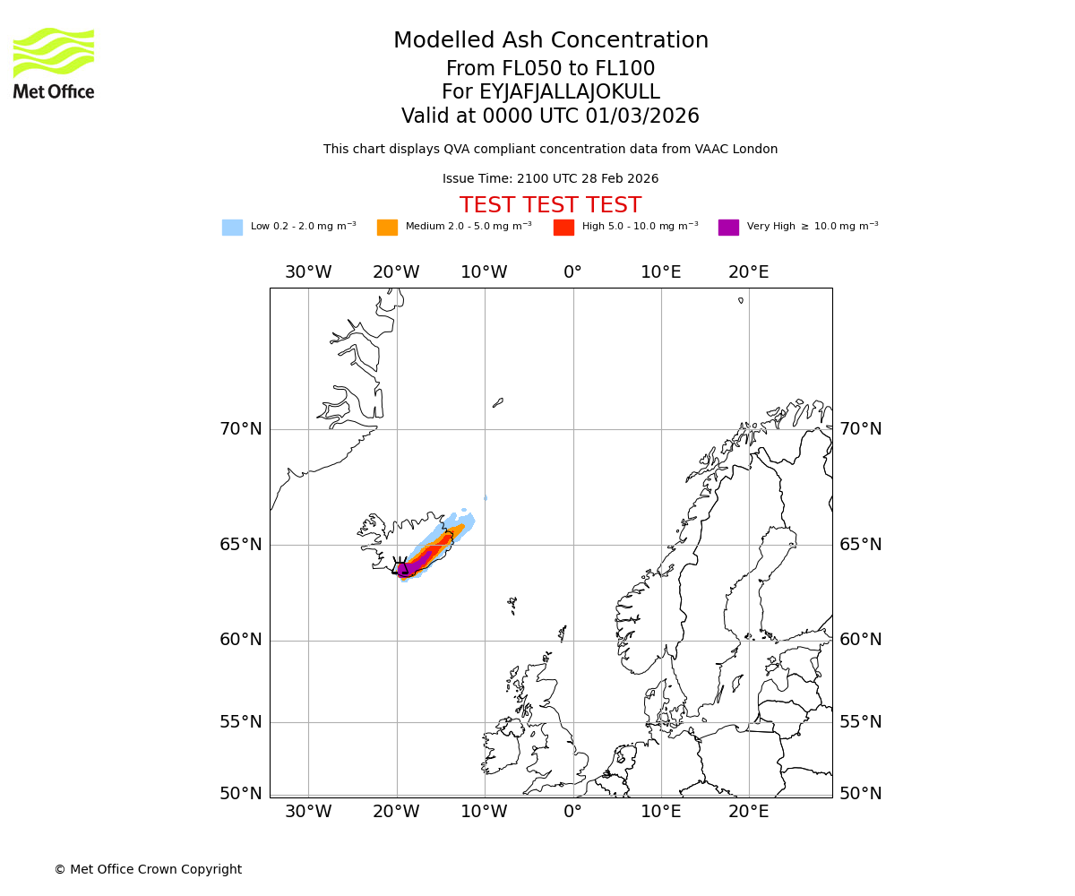 Modelled ash concentration from 000 to 050 for EYJAFJALLAJOKULL. Valid at 0000 UTC 01/03/2026