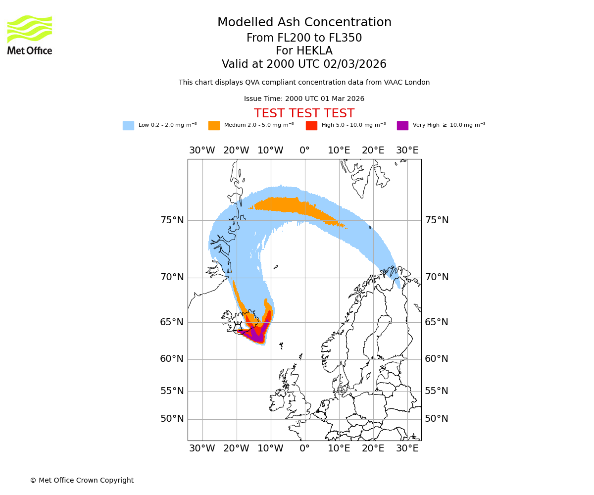 Modelled ash concentration from 000 to 200 for HEKLA. Valid at 2000 UTC 02/03/2026