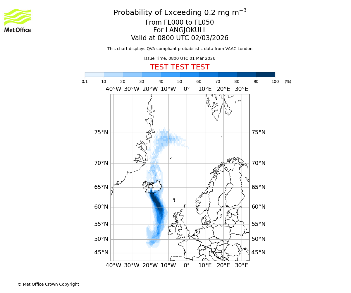 Modelled ash concentration from 000 to 200 for LANGJOKULL. Valid at 0800 UTC 01/03/2026
