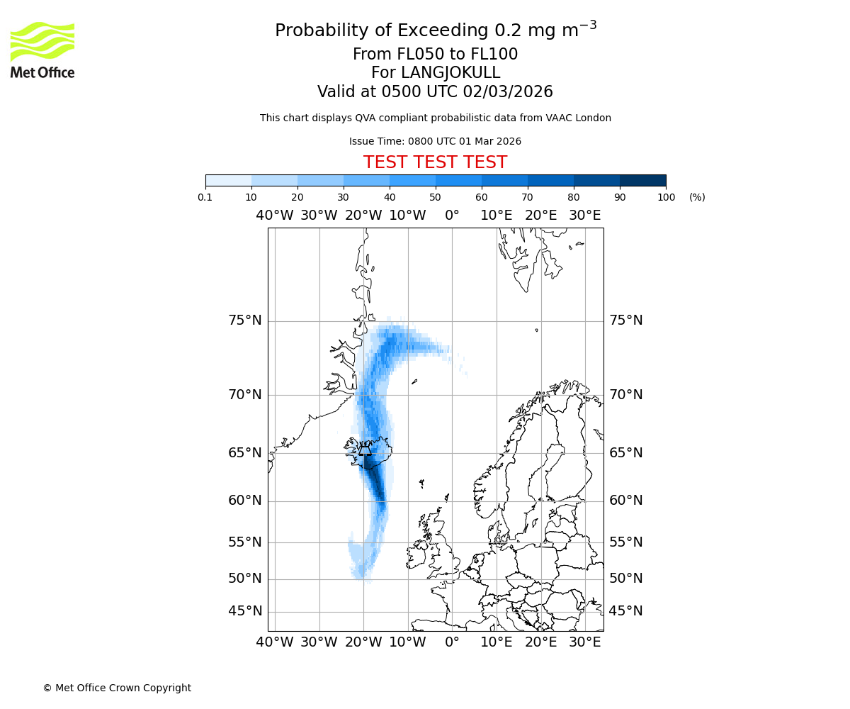 Modelled ash concentration from 000 to 050 for LANGJOKULL. Valid at 0800 UTC 01/03/2026