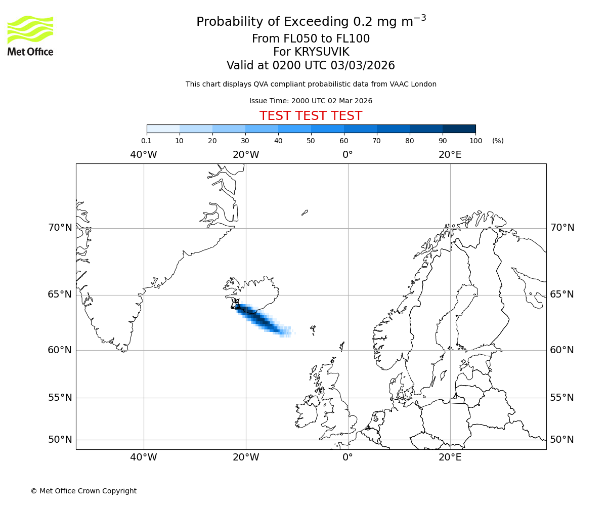 Probability of exceeding 0.2 milligrams per metre cubed. From 000 to 050 for KRYSUVIK. Valid at 0200 UTC 03/03/2026