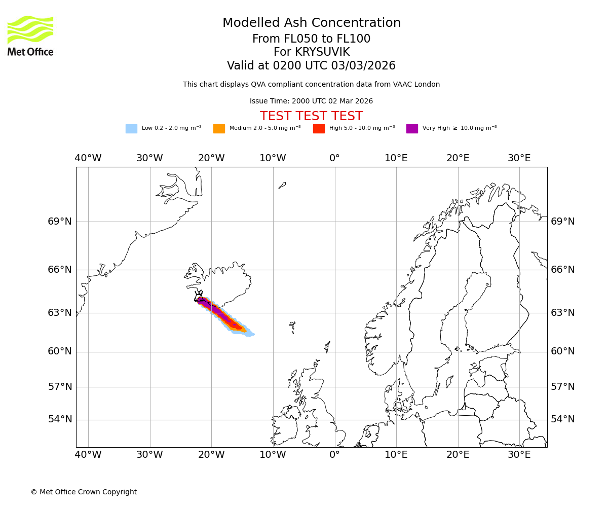 Modelled ash concentration from 000 to 050 for KRYSUVIK. Valid at 0200 UTC 03/03/2026