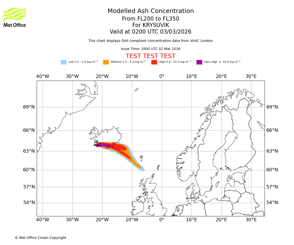 Modelled ash concentration from 000 to 200 for KRYSUVIK. Valid at 0200 UTC 03/03/2026