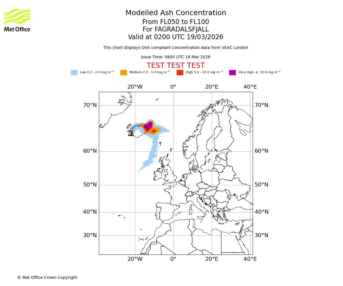 Modelled ash concentration from 000 to 200 for FAGRADALSFJALL. Valid at 0800 UTC 18/03/2026