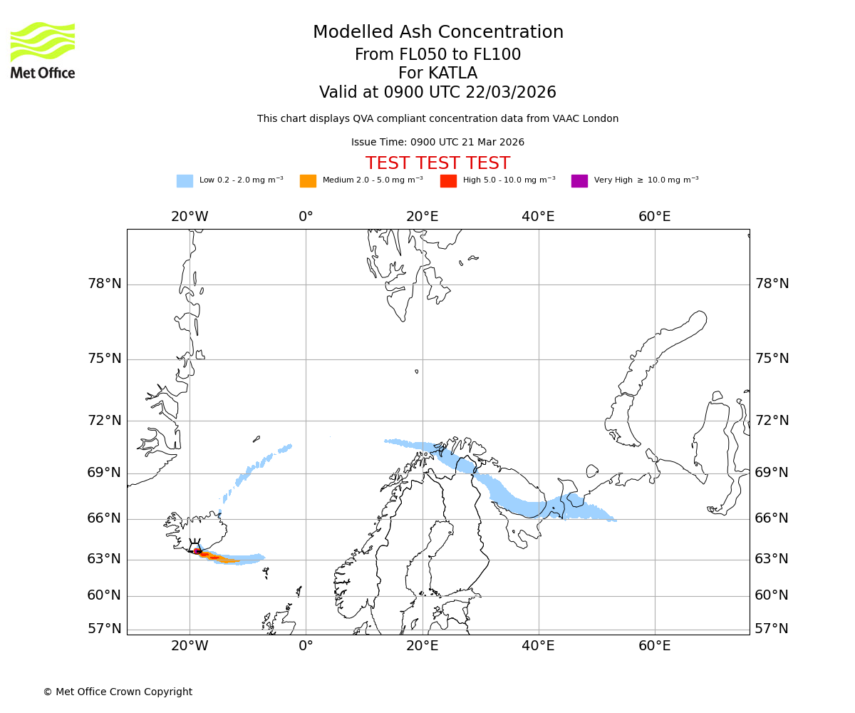 Modelled ash concentration from 000 to 050 for KATLA. Valid at 0900 UTC 22/03/2026