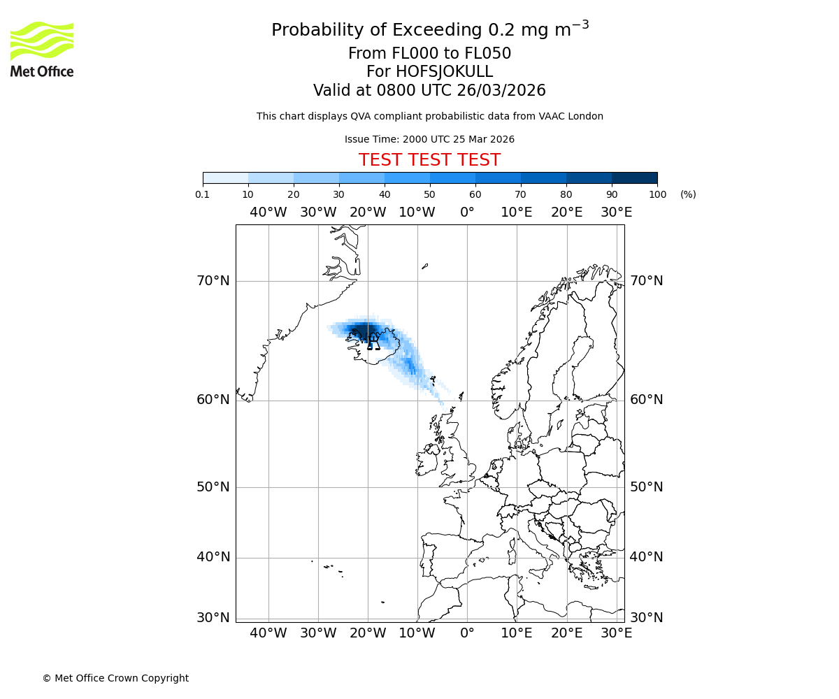 Modelled ash concentration from 000 to 050 for HOFSJOKULL. Valid at 2000 UTC 25/03/2026