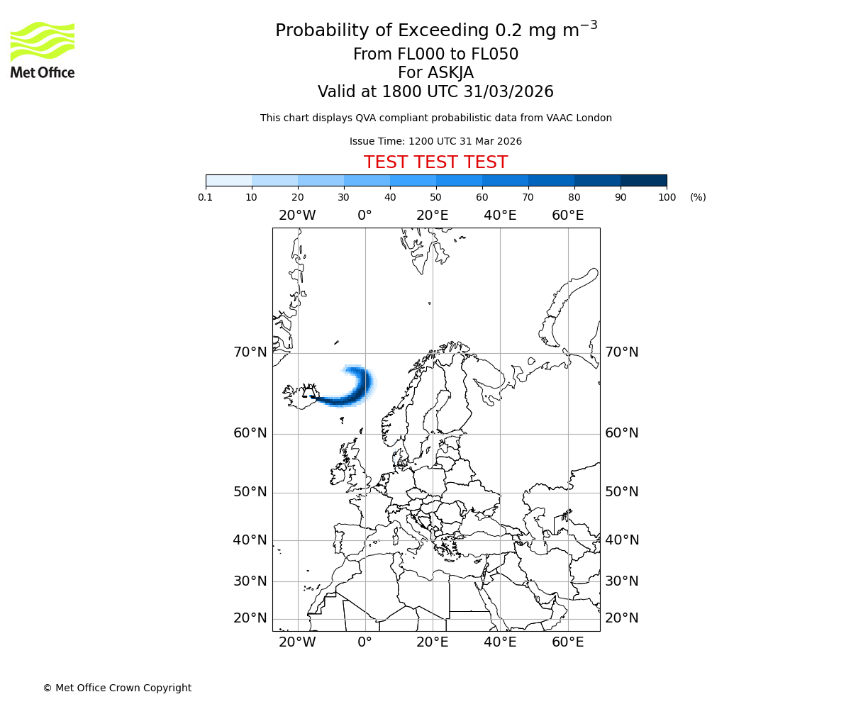Probability of exceeding 0.2 milligrams per metre cubed. From 000 to 050 for ASKJA. Valid at 1500 UTC 31/03/2026