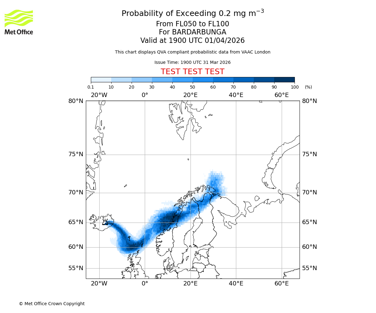 Probability of exceeding 0.2 milligrams per metre cubed. From 000 to 050 for BARDARBUNGA. Valid at 1900 UTC 01/04/2026