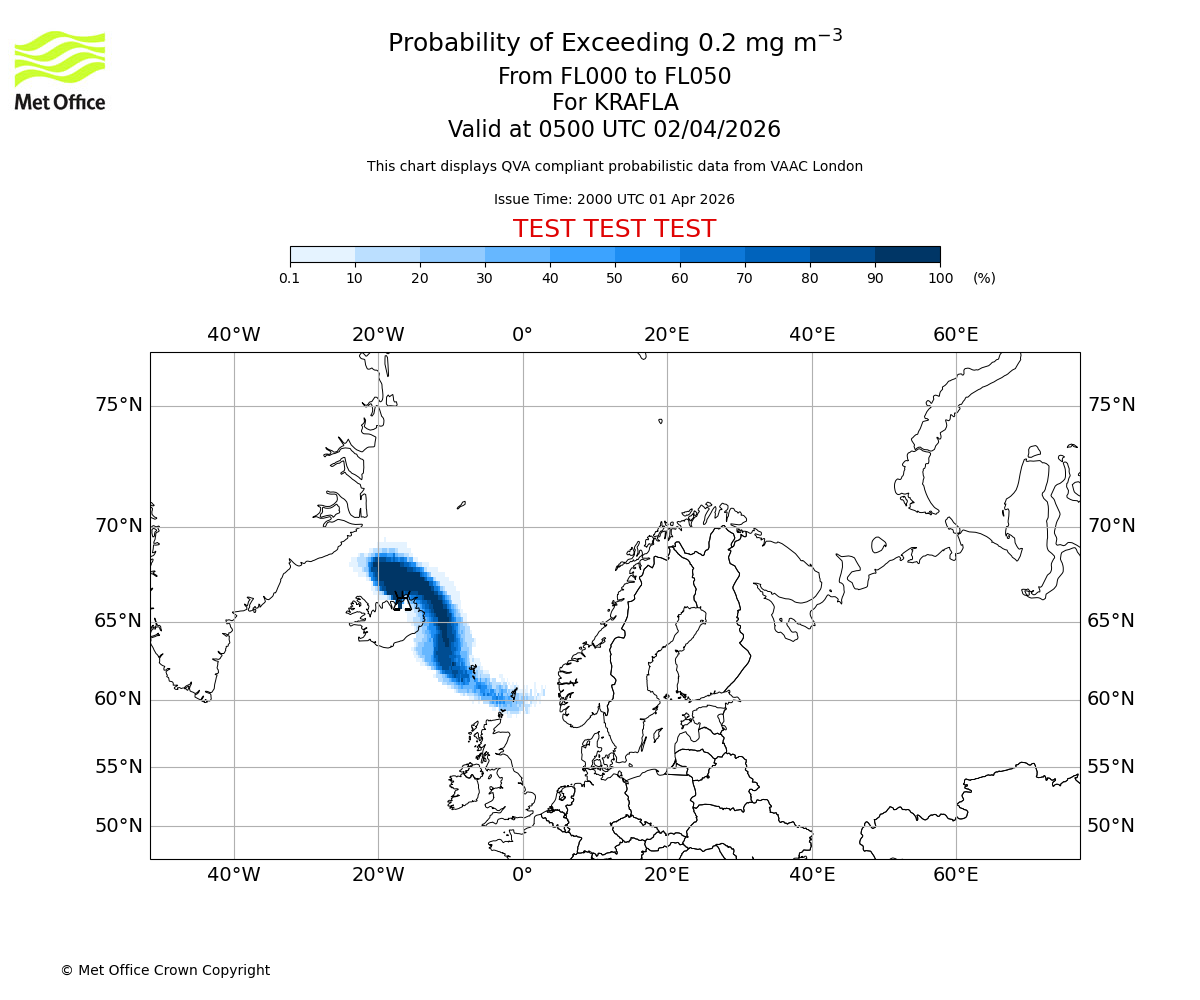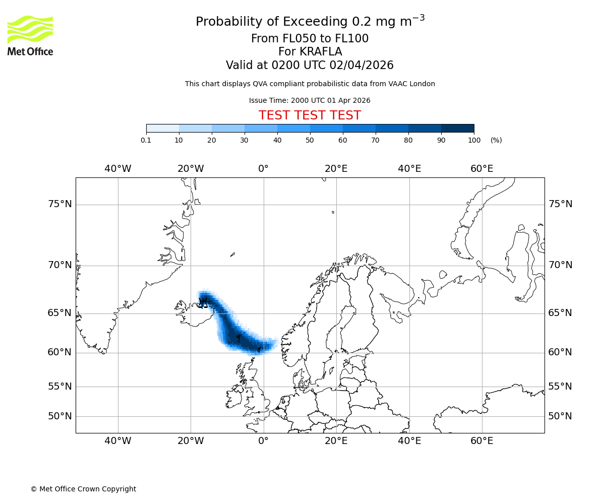 Probability of exceeding 0.2 milligrams per metre cubed. From 000 to 050 for KRAFLA. Valid at 0200 UTC 02/04/2026