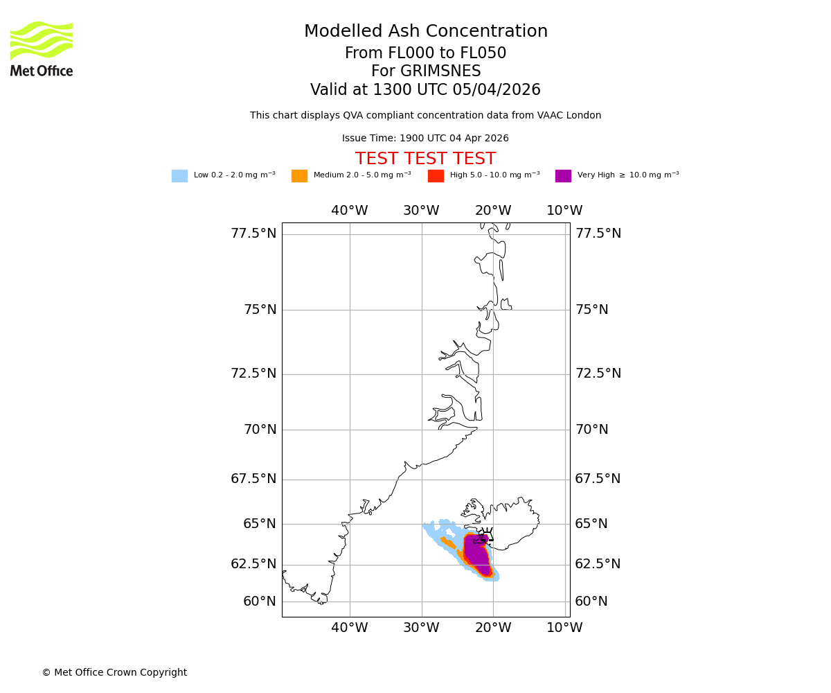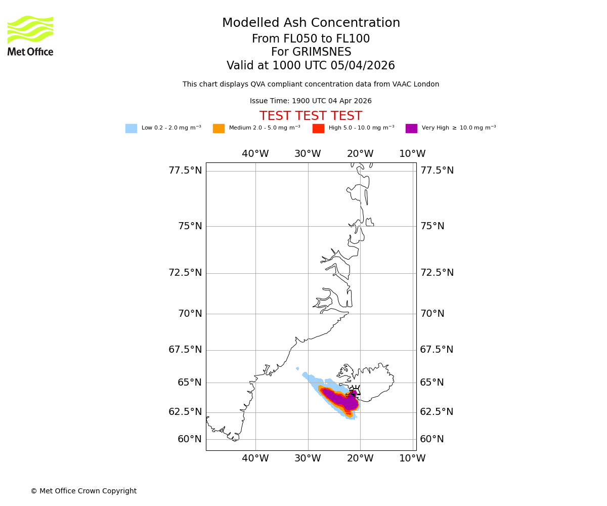 Modelled ash concentration from 000 to 050 for GRIMSNES. Valid at 1000 UTC 05/04/2026