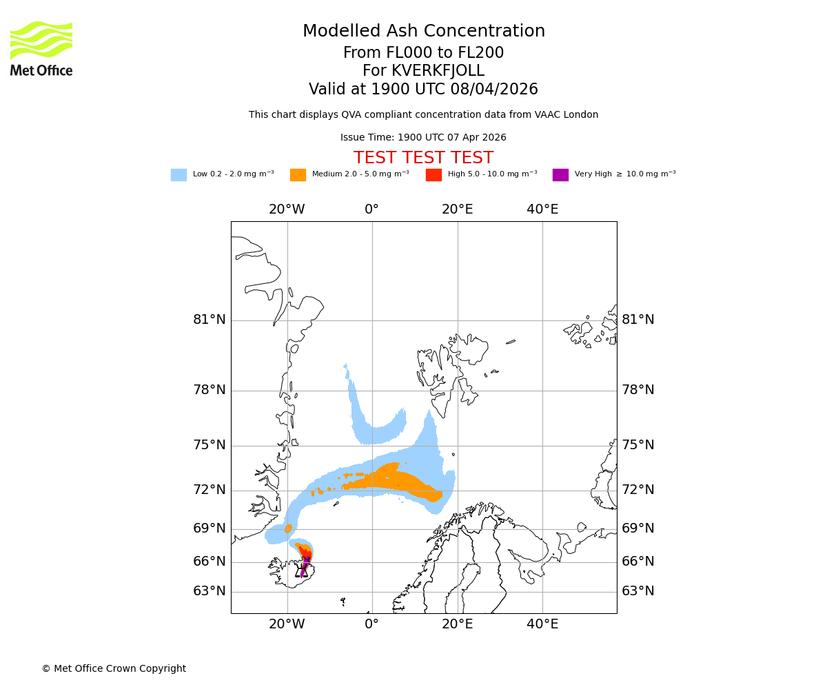 Modelled ash concentration from 000 to 050 for KVERKFJOLL. Valid at 1900 UTC 07/04/2026