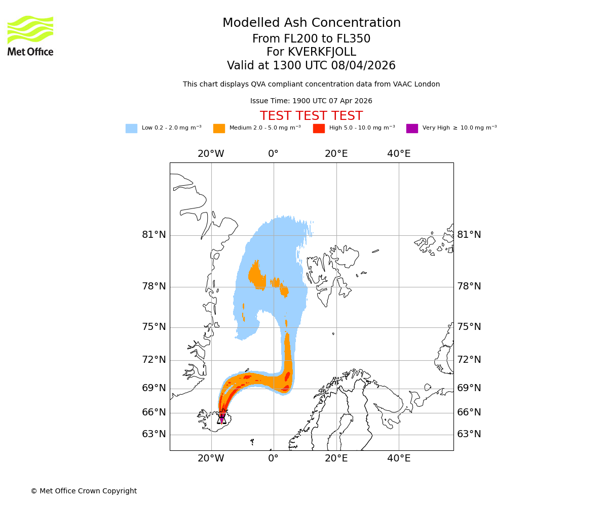 Modelled ash concentration from 000 to 200 for KVERKFJOLL. Valid at 1300 UTC 08/04/2026