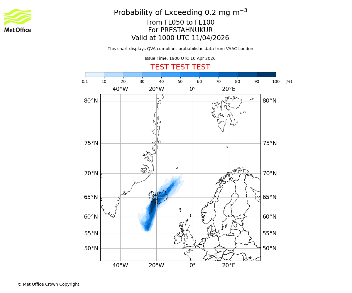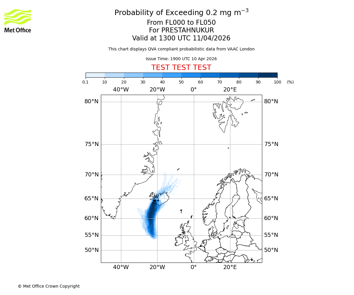 Modelled ash concentration from 000 to 050 for PRESTAHNUKUR. Valid at 1900 UTC 10/04/2026