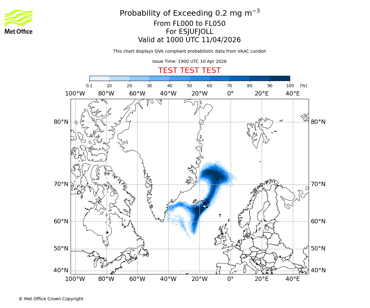Quantitative Volcanic Ash charts (QVA) are produced in accordance with International Civil Aviation Organization (ICAO) Annex 3 requirements and are provided as well as the London Volcanic Ash Advisory Graphics (VAG) and Advisories (VAA). The lowest QVA threshold (0.2 mg/m³) matches to the areas depicted in the VAA and VAG. Both expected ash concentration and probabilistic forecast information is provided in the chart viewer below for eruptions occurring in the London Volcanic Ash Advisory Centre (VAAC) area of responsibility.