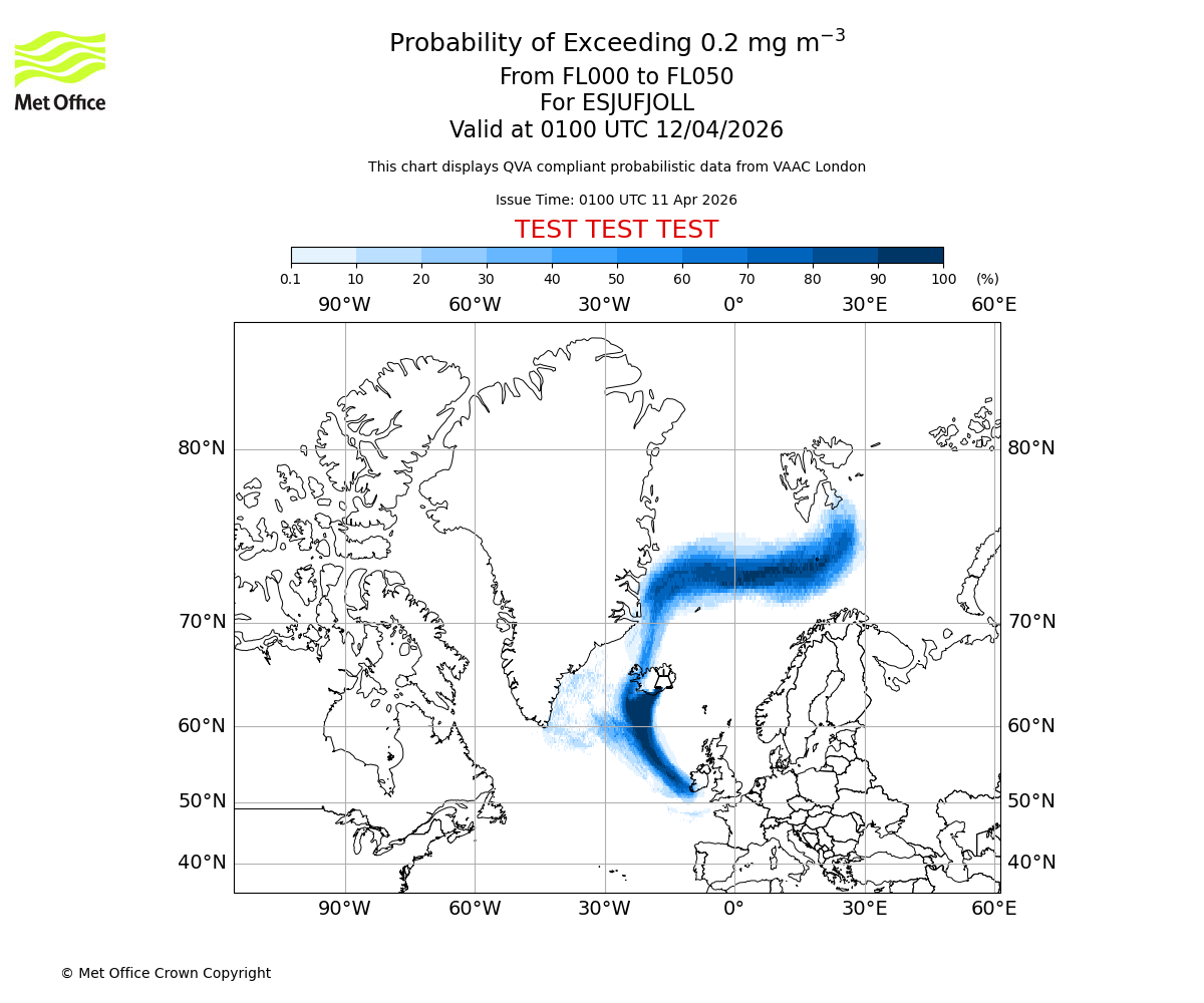 Quantitative Volcanic Ash charts (QVA) are produced in accordance with International Civil Aviation Organization (ICAO) Annex 3 requirements and are provided as well as the London Volcanic Ash Advisory Graphics (VAG) and Advisories (VAA). The lowest QVA threshold (0.2 mg/m³) matches to the areas depicted in the VAA and VAG. Both expected ash concentration and probabilistic forecast information is provided in the chart viewer below for eruptions occurring in the London Volcanic Ash Advisory Centre (VAAC) area of responsibility.