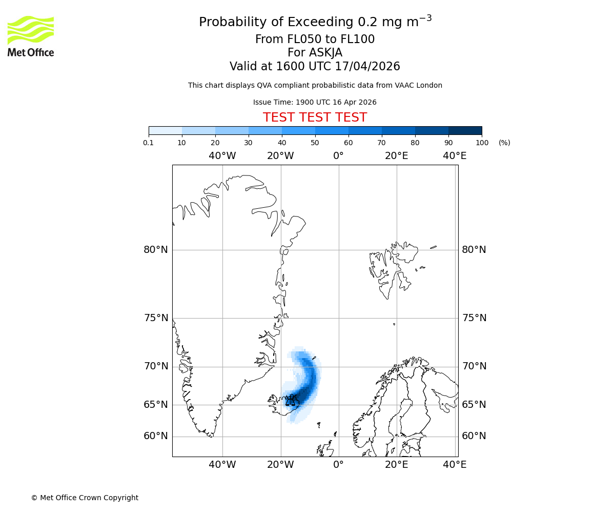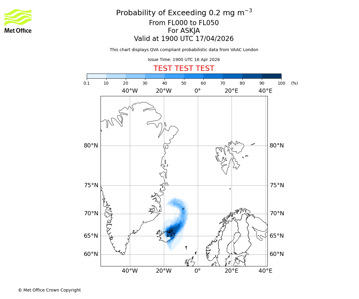 Probability of exceeding 0.2 milligrams per metre cubed. From 000 to 050 for ASKJA. Valid at 1600 UTC 17/04/2026